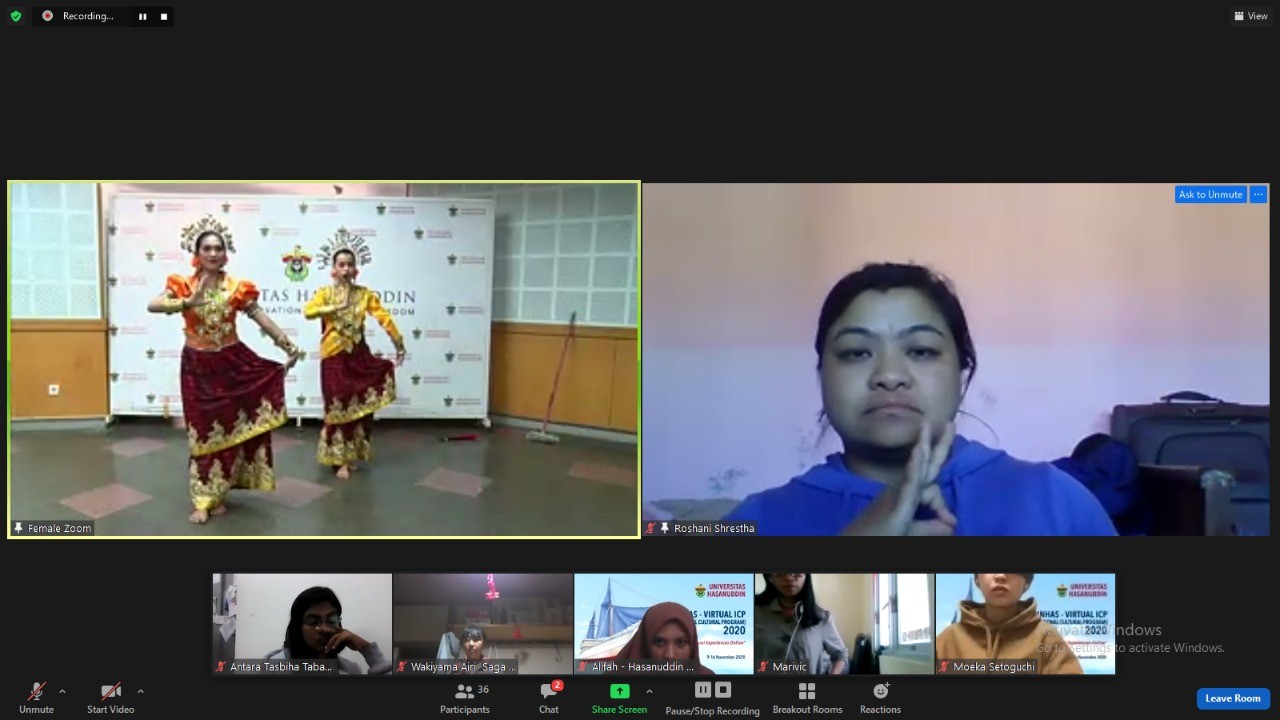 PELAKITA.ID – Pada penyelenggaraan International Culture Program (ICP) Universitas Hasanuddin hari keempat, para peserta yang berasal dari 18 negara belajar tarian tradisional Bugis-Makassar. Kegiatan berlangsung mulai pukul 15.00 Wita secara virtual melalui aplikasi Zoom Meeting, Kamis (12/11).