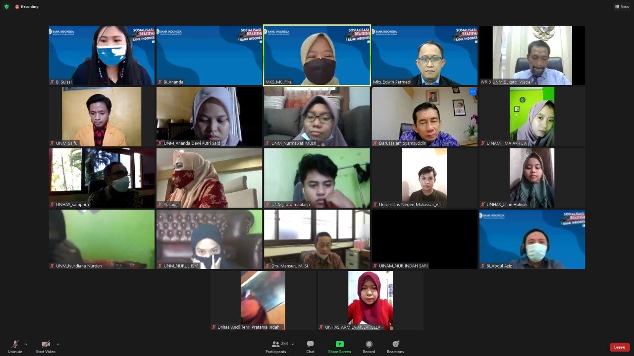PELAKITA.ID – Bank Indonesia Perwakilan Sulawesi Selatan menyelenggarakan Sosialisasi Program Beasiswa Bank Indonesia Tahun 2021 untuk mahasiswa Universitas Hasanuddin. Kegiatan berlangsung mulai pukul 10.30 Wita secara virtual melalui aplikasi zoom meeting, Kamis (11/02).