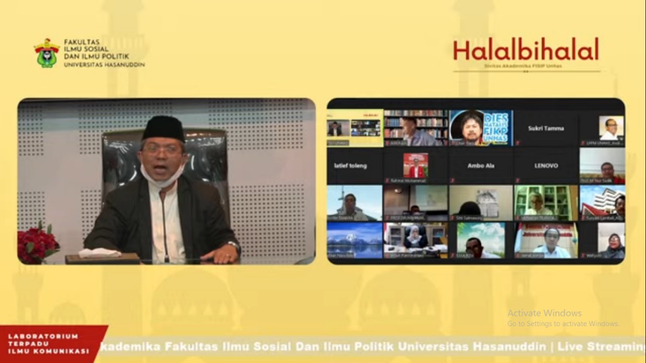 Dekan Fisip Unhas, Prof. Dr. Armin, M.Si., menyampaikan dalam sambutannya bahwa kegiatan halal bihalal, meskipun dilakukan secara virtual, namun diharapkan tidak mengurangi maknanya sebagai sarana meningkatkan silaturahmi dan pahala.