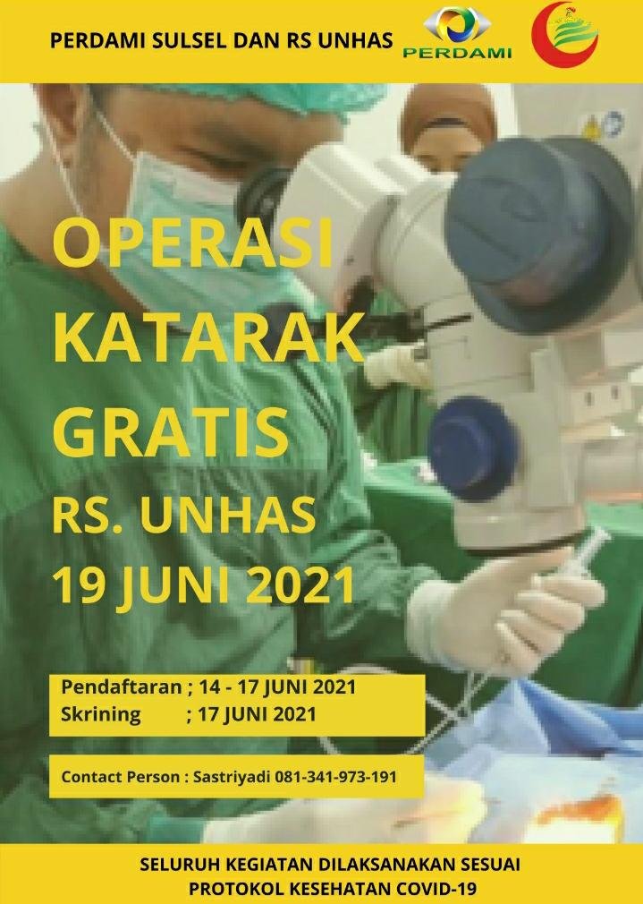 PELAKITA.ID – Rumah Sakit Pendidikan Tinggi Negeri (RSPTN) Universitas Hasanuddin kerja sama Perhimpunan Dokter Spesialis Mata Indonesia (PERDAMI) wilayah Sulawesi Selatan akan menyelenggarakan operasi katarak gratis. Pendaftaran peserta telah dibuka pada Senin (14/06) hingga Kamis (17/06).