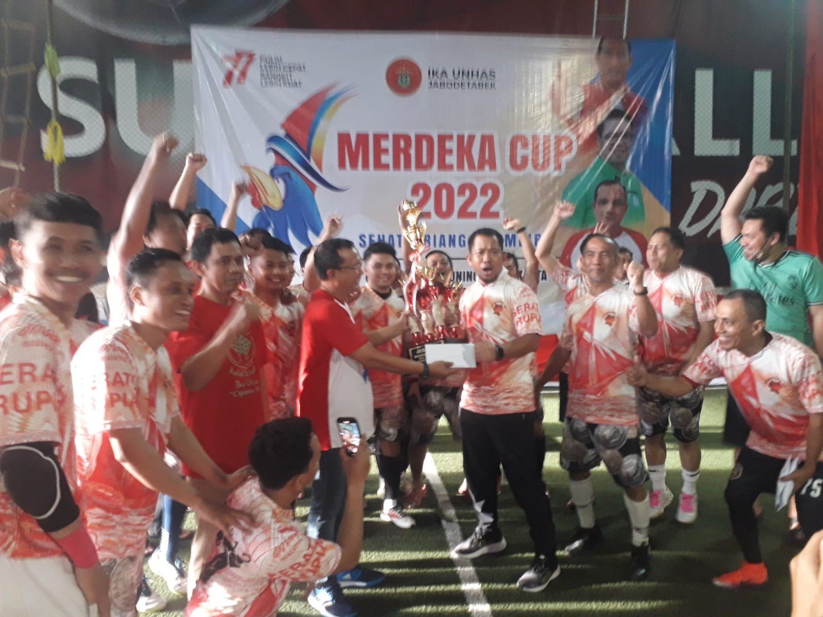 “Kami ucapkan terima kasih juga kepada sponsor seperti Gojek, PT Pindad, Chando, IKA Unhas dan pihak lain yang mendukung kesuksesan Merdeka Cup 2022 ini,” kata Ketua Kerukunan Komunikasi Unhas ini.