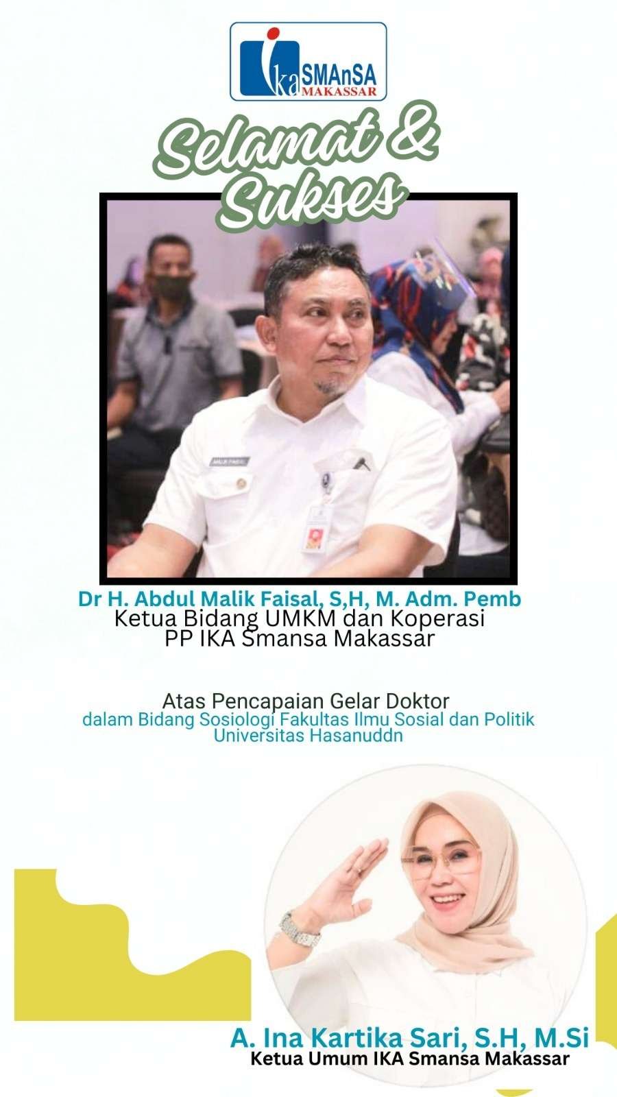 “Selamat kepada kanda Dr Abdul Malik Faisal yang telah meraih gelar doktornya, semoga ilmu, amal, padu mengabdi, baik untuk karir, organisasi dan masyarakat luas,” ucap Andi Ina.
