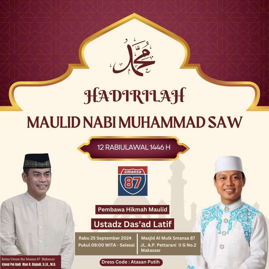 ”Terima kasih kepada warga, kepada jemaah dan keluarga IKA Smansa Makassar serta undangan yang hadir pada kegiatan Maulid Nabi Besar kita Muhammad sallallahu alaihi wasallam,” ucap Jenderal Bintang Dua POLRI ini.