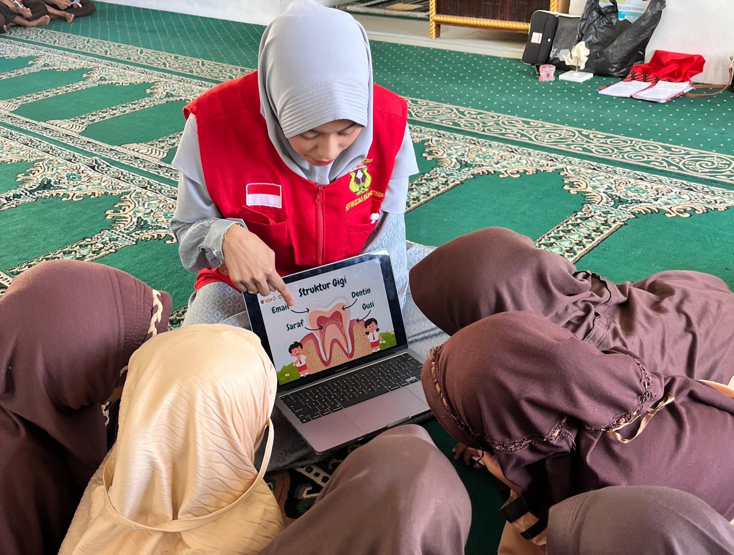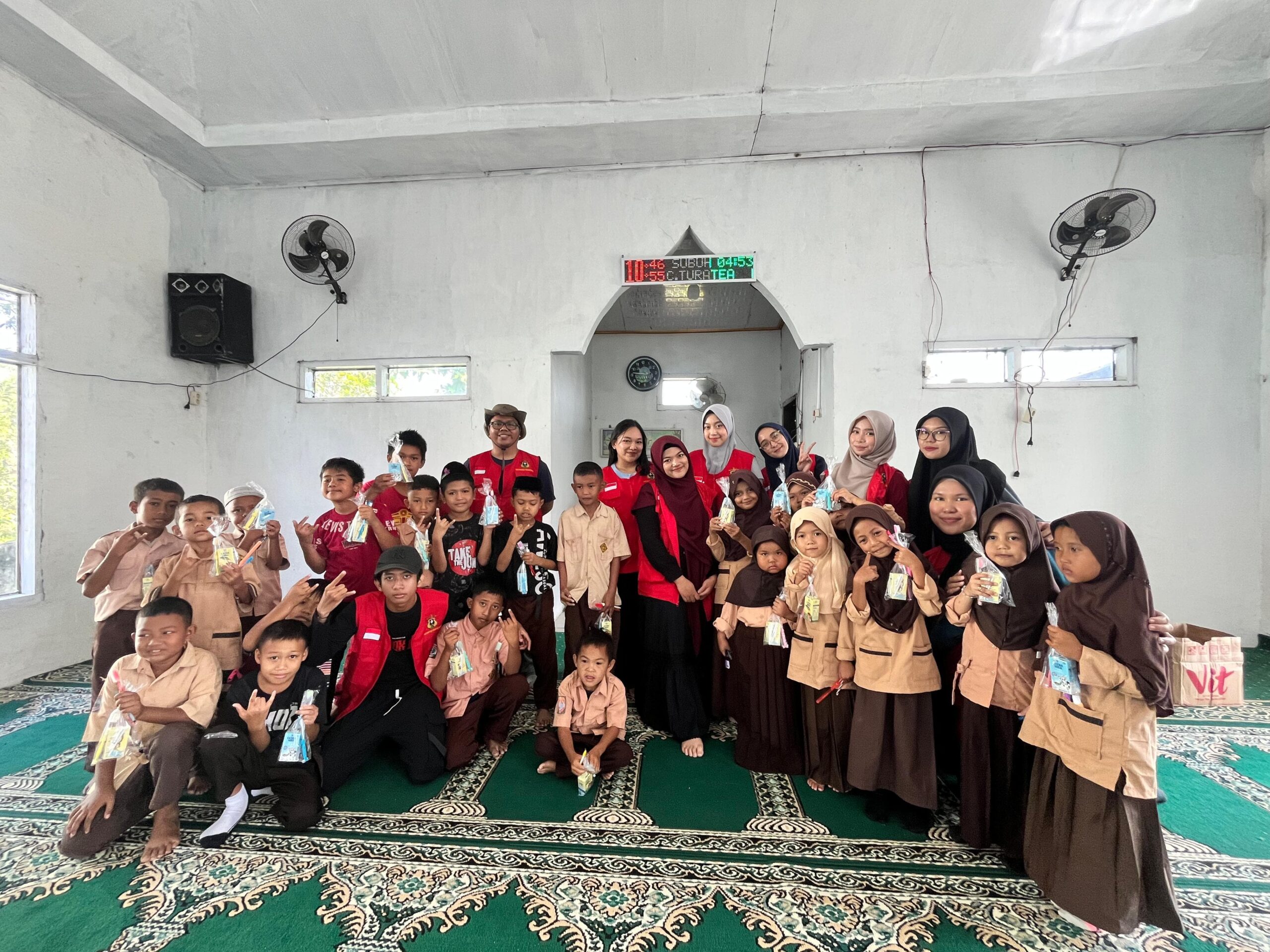 Suasana kegiatan berlangsung penuh antusias. Para siswa aktif mengikuti penyuluhan dan praktik sikat gigi bersama.