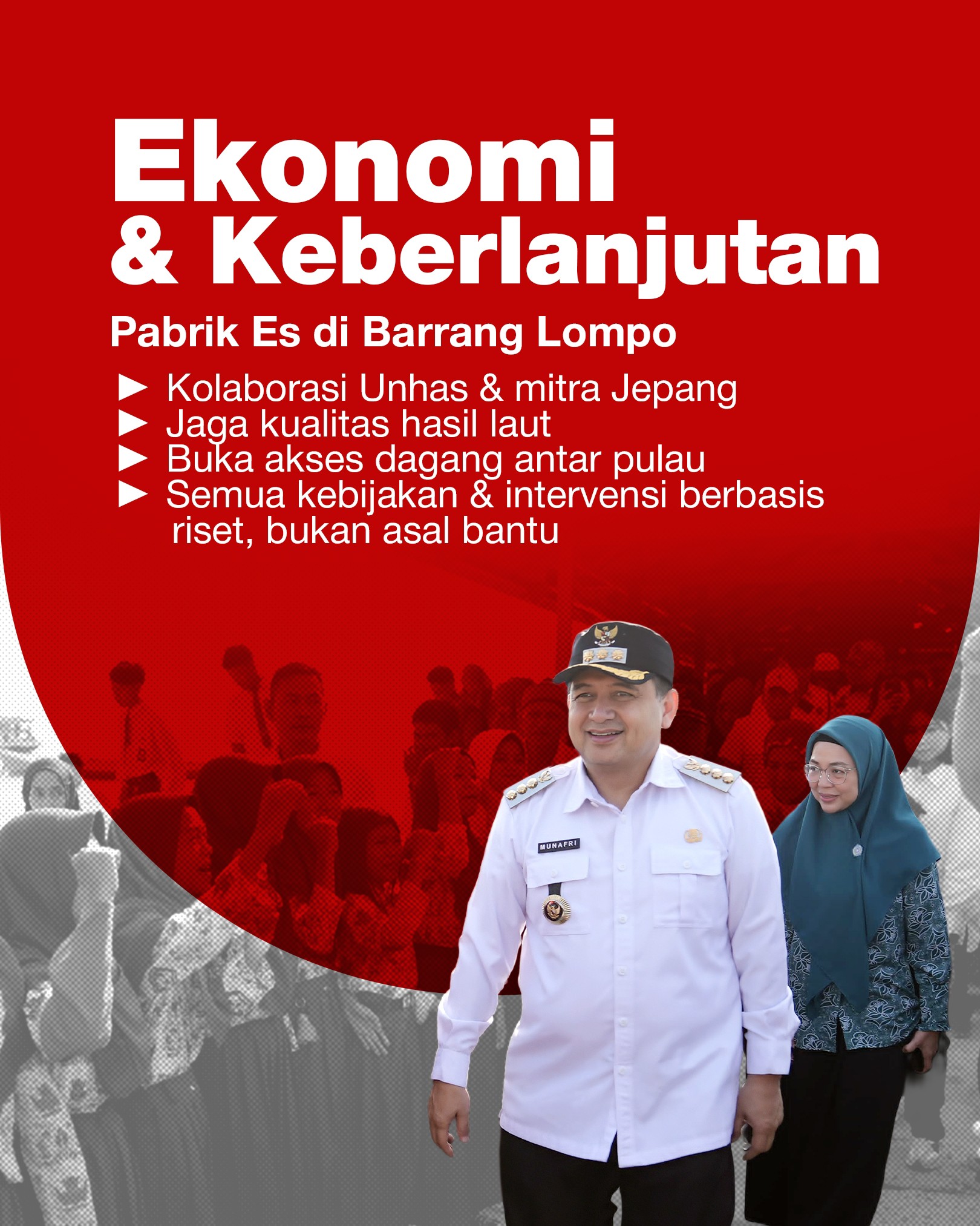 Di bidang ekonomi, Munafri mengungkapkan pembangunan pabrik es di Barrang Lompo yang dikerjakan bersama Universitas Hasanuddin dan mitra dari Jepang. Pabrik ini bertujuan menjaga kualitas hasil laut, memperkuat rantai pasok, serta membuka akses perdagangan antarpulau.