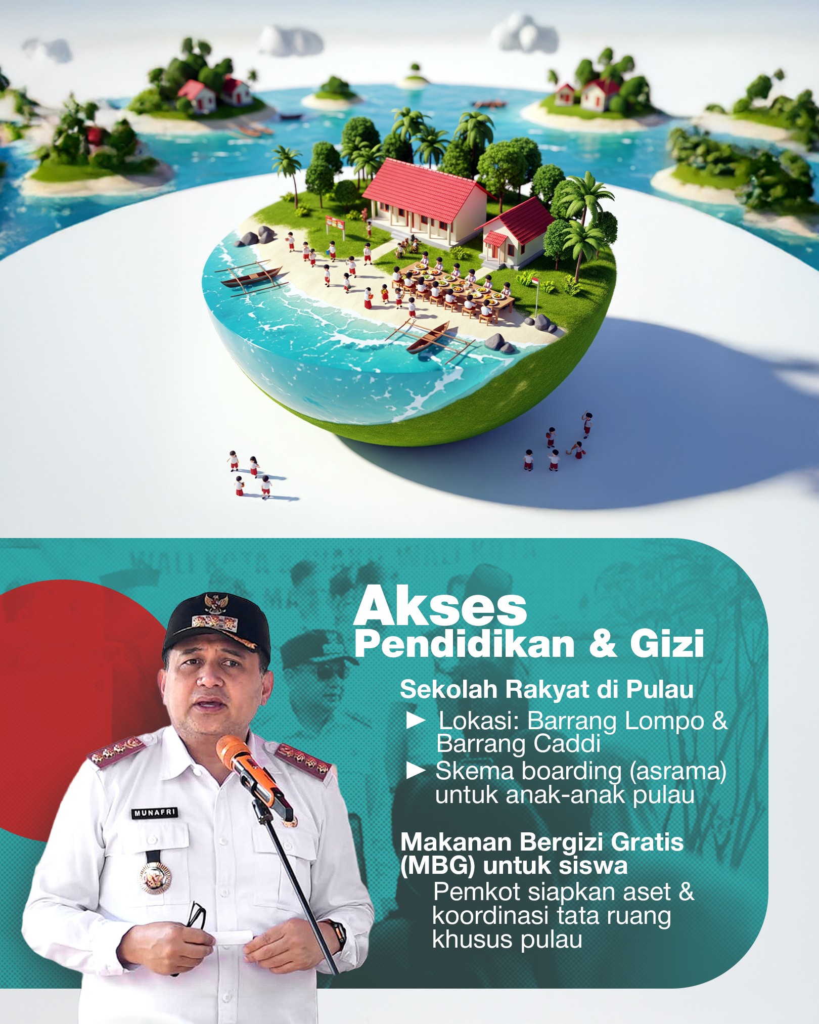 Sebagai wujud komitmen tersebut, Pemerintah Kota Makassar akan mendirikan Sekolah Rakyat dengan skema boarding school (asrama) di Pulau Barrang Lompo dan Barrang Caddi.