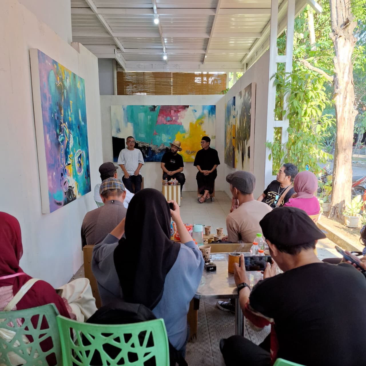 Diskusi tersaji jelang senja dipandu Faisal Syarif, Ketua MAIM. Sore itu juga telah tercipta sebuah percakapan yang tidak mudah dan butuh perenungan makna dihadapan gelas kopi. Lukisan karya Alan yang terpajang menampilkan tekstur dalam memetakan serpihan yang kaya akan endapan pengalaman hidup.