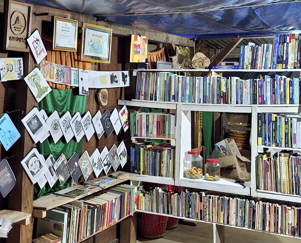 Begitu melangkah masuk, mata disambut oleh tumpukan buku—bukan dengan kerapian perpustakaan pemerintah, melainkan kekacauan yang hidup. Ada yang digantung dengan tali, berserakan di meja, atau ditumpuk seadanya di pojok ruangan. Aroma kertas lama bercampur dengan kopi hitam dan asap rokok yang tak pernah benar-benar padam.