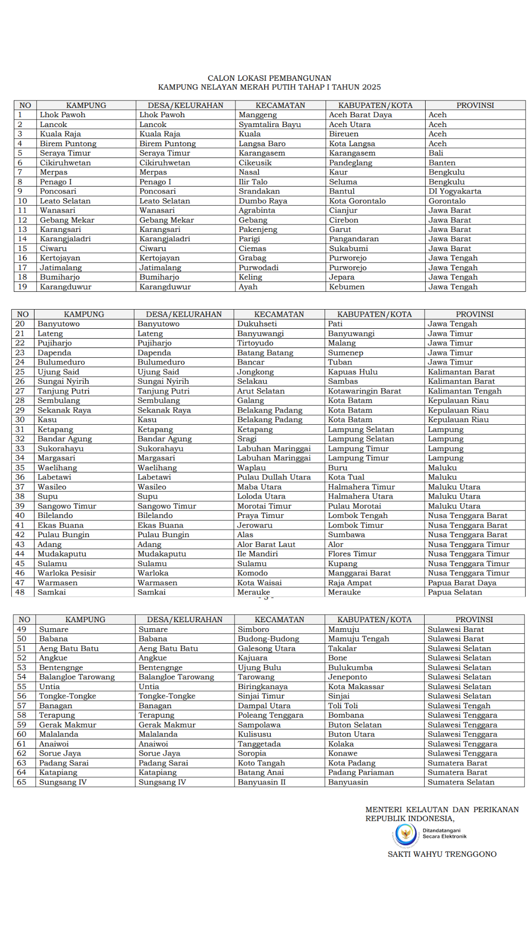 Lampiran Kepmen ini menyebutkan secara rinci 65 kampung nelayan yang akan dibangun pada tahap pertama 2025.