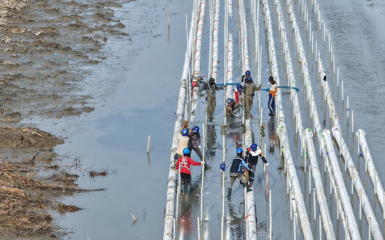 “Pembangunan fisik saat ini masih berlangsung, antara lain pencetakan kolam, pemasangan geomembran, konstruksi intake air laut dan tawar, serta pemasangan tiang listrik pada petakan kolam,” jelas Tebe dalam siaran resmi di Jakarta, Senin (27/10).