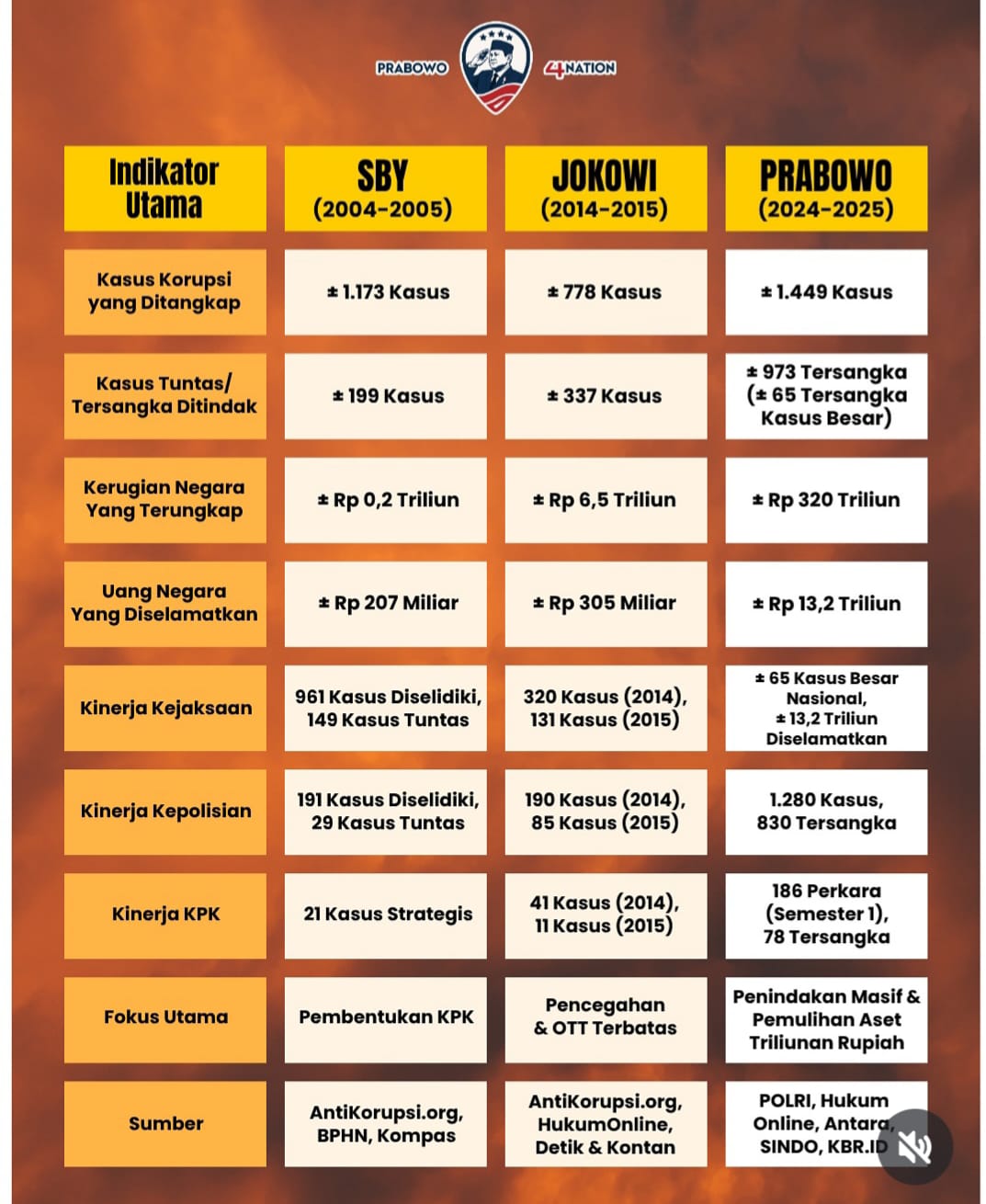 Dengan demikian, tabel ini memperlihatkan bagaimana arah dan fokus pemberantasan korupsi di Indonesia berevolusi—dari pembentukan lembaga (era SBY), penguatan mekanisme pencegahan (era Jokowi), hingga intensifikasi penindakan dan pemulihan aset besar-besaran (era Prabowo).