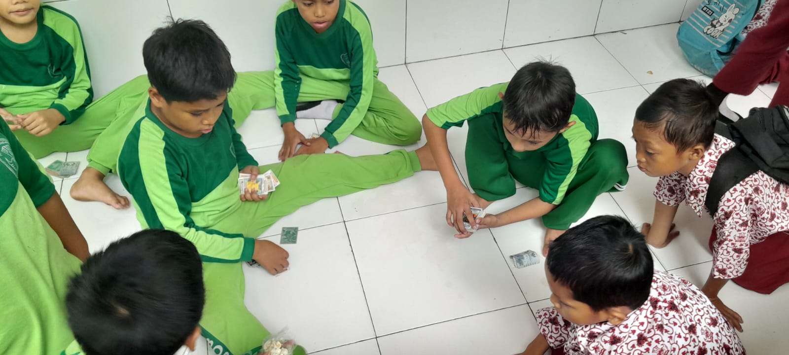 Mereka duduk saling berhadapan 4-6 orang. Ada juga yang hanya menonton temannya bermain, sambil menyantap jajanan yang dibeli di kantin sekolah.