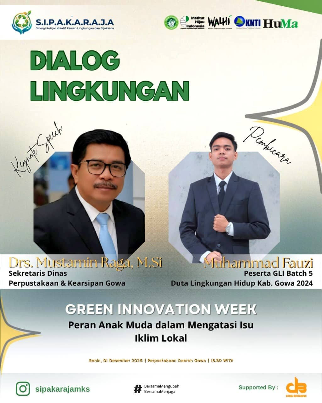 Sesi akan dibuka dengan Keynote Speaker oleh Drs. Mustarmin Raga, M.Si, yang menjabat sebagai Sekretaris Dinas Perpustakaan & Kearsipan Gowa. Perspektif dari generasi muda diwakili oleh Muhammad Fauzi, yang merupakan Peserta GLI Batch 5 sekaligus Duta Lingkungan Hidup Kabupaten Gowa 2024.