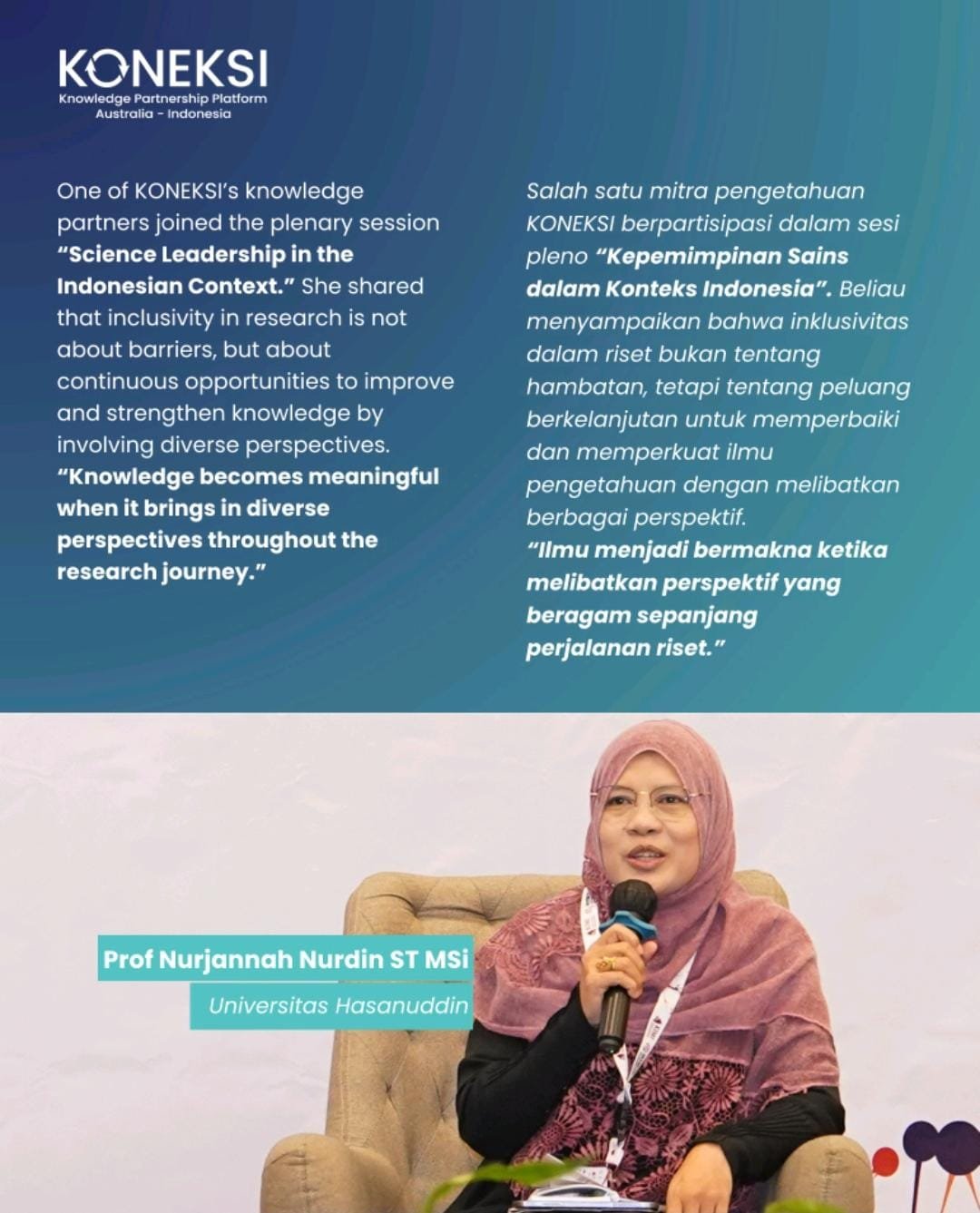 Sebagai mitra pengetahuan KONEKSI atau Knowledge Partnership Platform Australia-Indonesia, Prof Nurjannah berbagi refleksi penting mengenai bagaimana kepemimpinan sains yang inklusif dapat memperkuat kualitas riset di Indonesia.