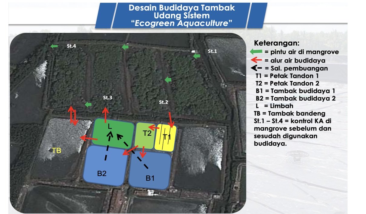 Salah satu contoh penerapan inovasi terpadu adalah desain tambak udang berbasis sistem Ecogreen Aquaculture. Sistem ini berbeda dengan model silvofishery tradisional yang masih bergantung pada padat tebar rendah dan pakan alami.