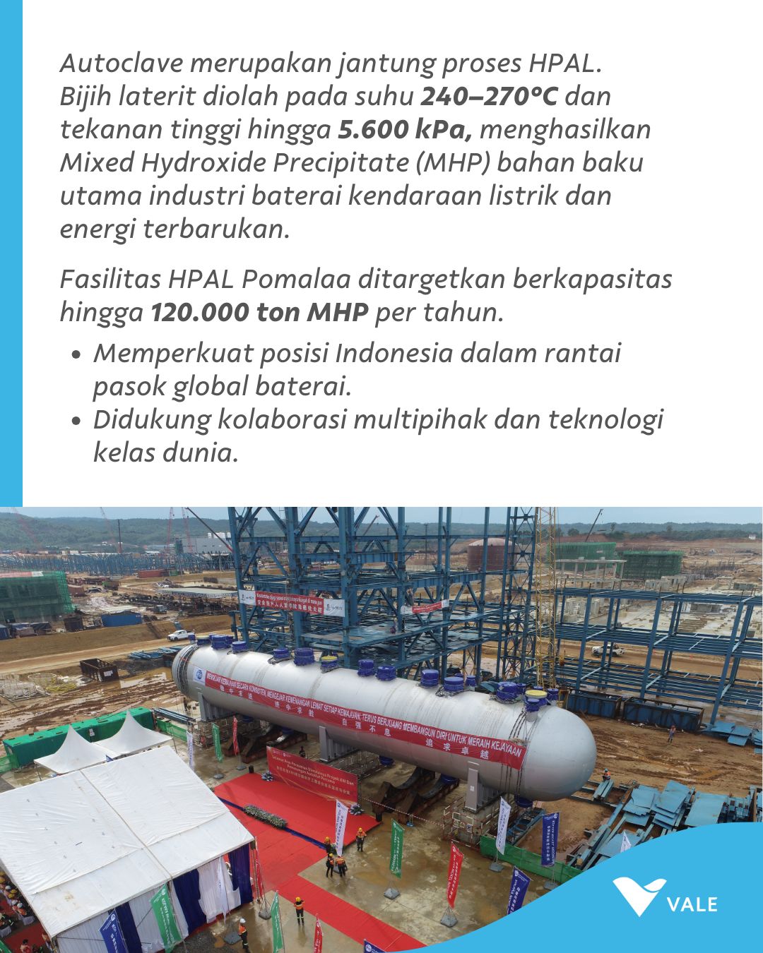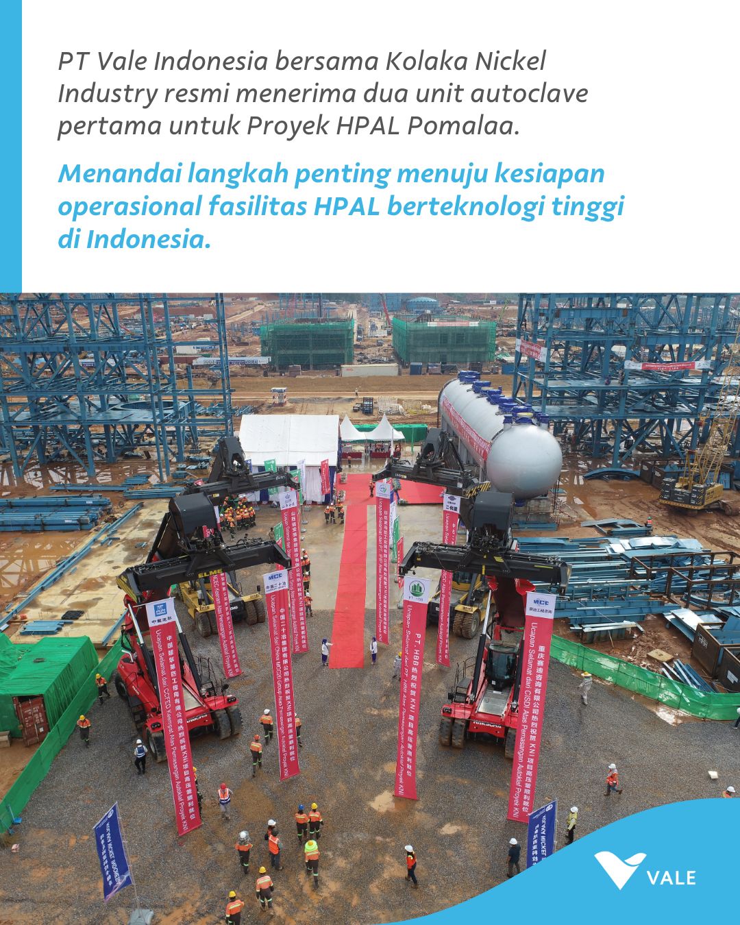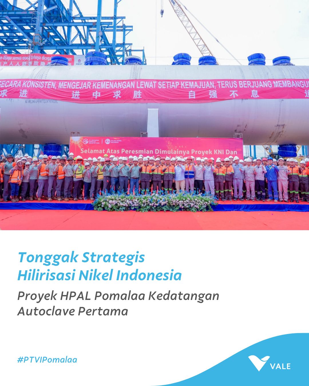 With the arrival of the first two autoclave units, PT Vale Indonesia, together with strategic partner Kolaka Nickel Industry, marks a significant milestone in the development of the Pomalaa HPAL Project, part of the Indonesia Growth Project.