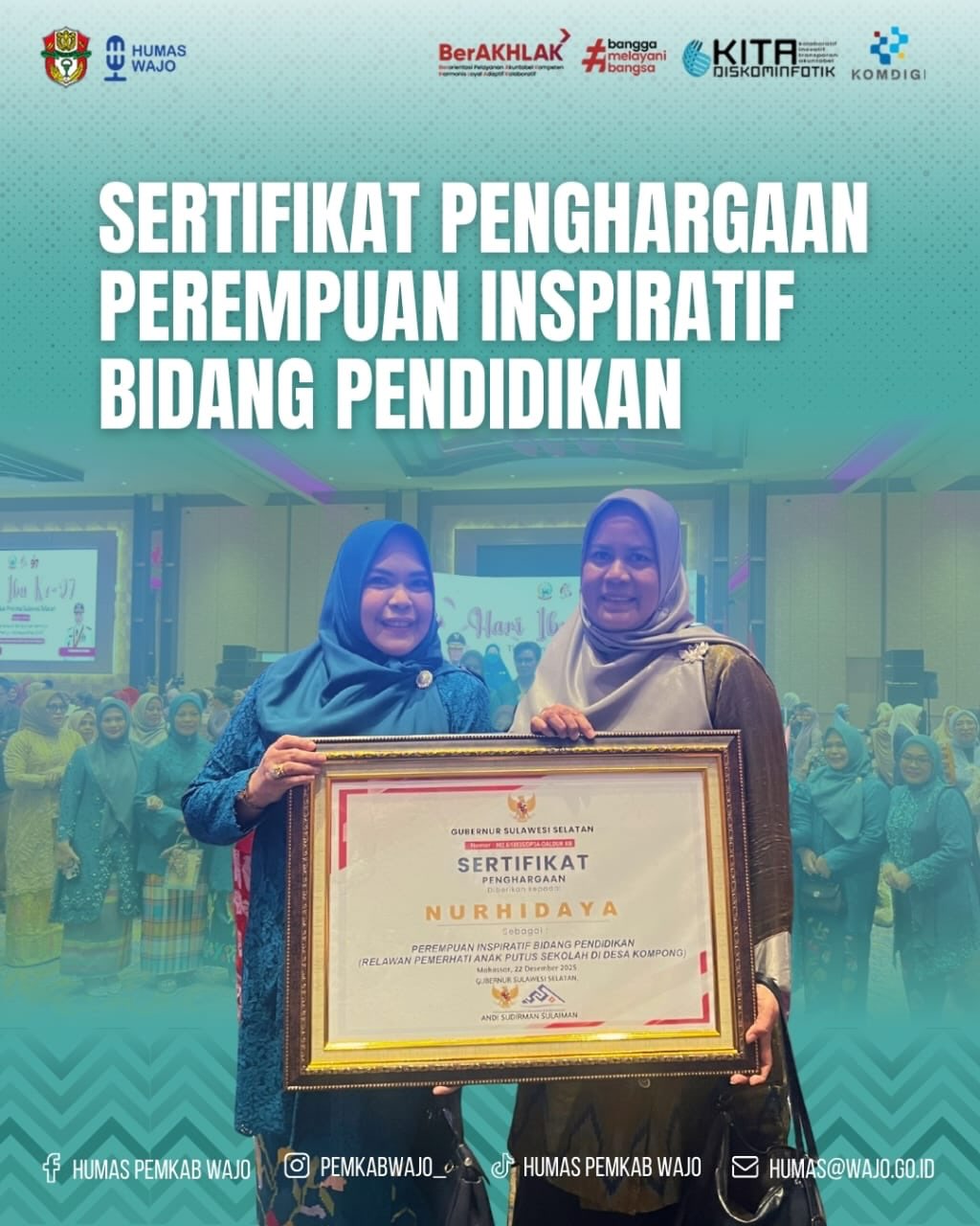 Makna tersebut terasa kuat dalam Puncak Peringatan Hari Ibu ke-97 Tingkat Provinsi Sulawesi Selatan yang digelar di Hotel Claro Makassar, Senin, 22 Desember 2025. Pada momentum ini, Ketua TP PKK Kabupaten Wajo, Ibu Hj. Fatmawati A. Rosman, menghadiri penyerahan sertifikat penghargaan kepada Nurhidaya sebagai Perempuan Inspiratif Bidang Pendidikan.