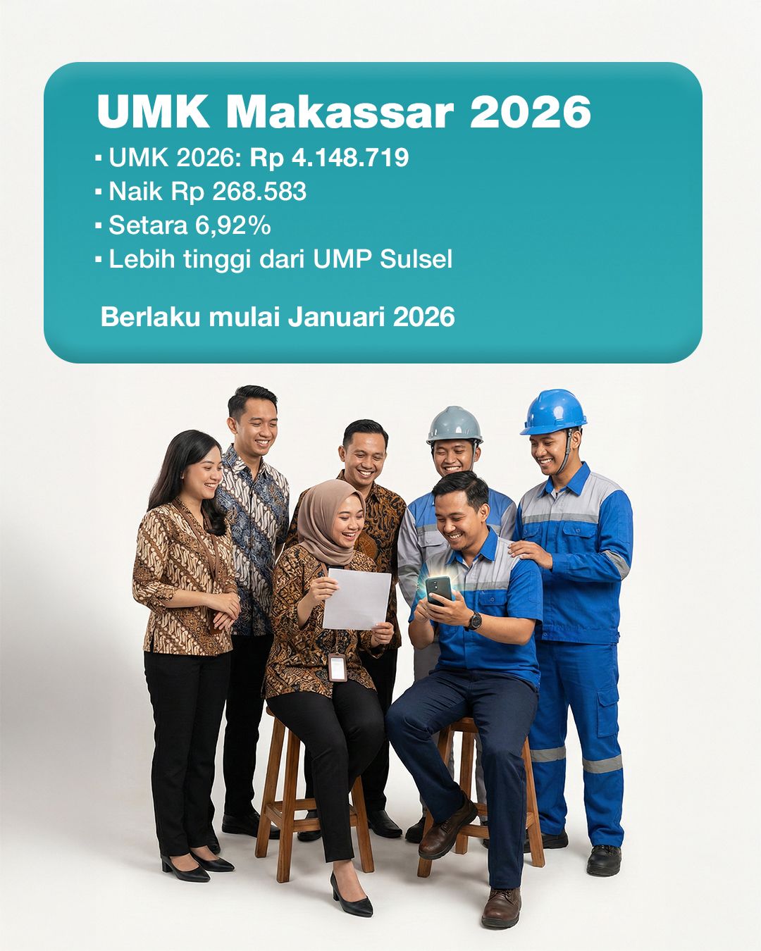 PELAKITA.ID – Awal tahun 2026 membawa kabar baik bagi para pekerja di Kota Makassar. Pemerintah Kota Makassar resmi menetapkan Upah Minimum Kota (UMK) 2026 sebesar Rp4.148.719, naik Rp268.583 atau 6,92 persen dibandingkan tahun sebelumnya.