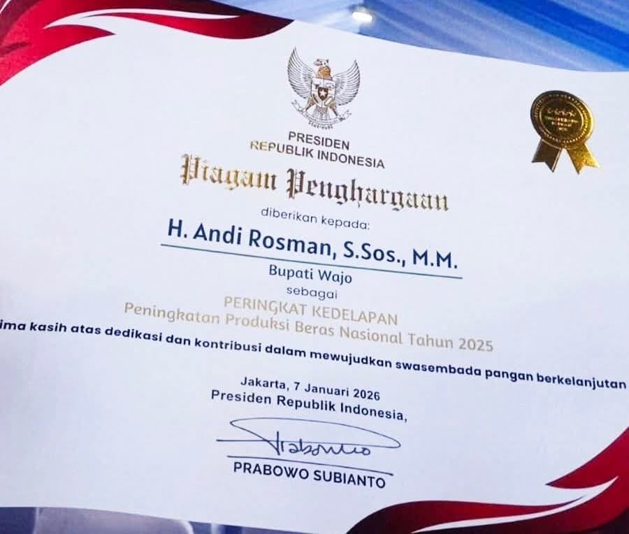 Bahkan, Kabupaten Wajo menempati peringkat kedelapan peningkatan produksi beras nasional tahun 2025. Acara itu berlangsung di Kabupaten Karawang, Jawa Barat, Rabu (7/1/2026).