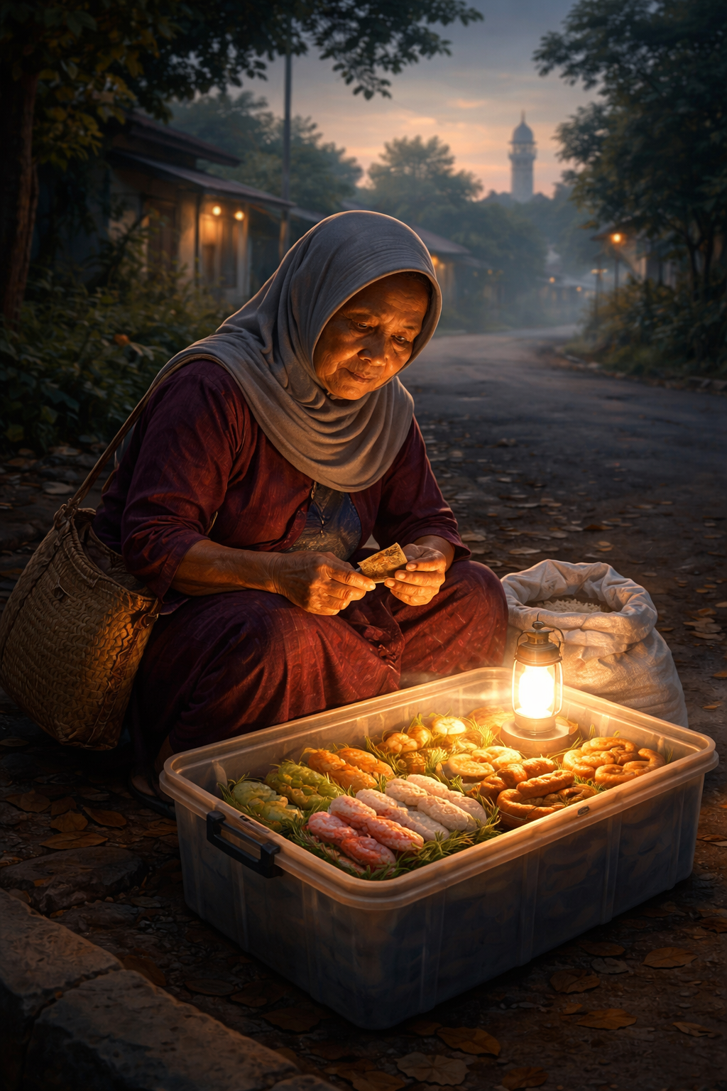 Perempuan itu—dengan penutup kepala khas—sedang memilah uang receh dan uang kertas. Uang perak dan putih. Ia duduk dengan kaki kiri dilipat di atas paha, jemarinya sibuk menggeser lembar demi lembar uang dengan gerakan tenang. Sangat santai, seolah waktu tidak sedang mengejarnya.