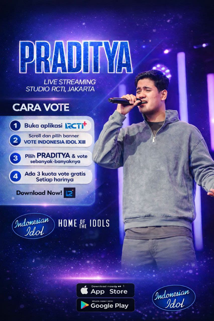 Cukup buka aplikasi RCTI+, lalu scroll hingga menemukan banner Vote Indonesian Idol XIII. Di sana, pilih nama ADITYA dan berikan vote sebanyak mungkin. Setiap akun mendapatkan tiga vote gratis setiap hari, jadi pastikan tidak ada satu pun yang terlewat.