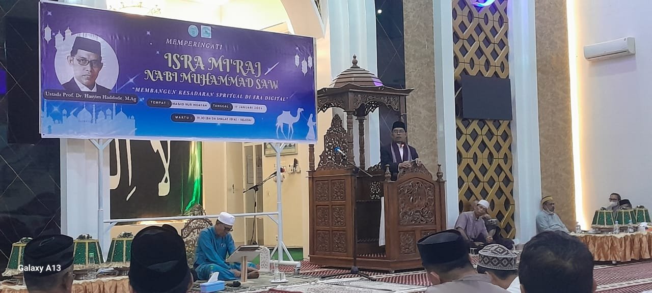 PELAKITA.ID — Prof. Dr. Hasyim Haddade, M.Ag., Guru Besar Universitas Islam Negeri (UIN) Alauddin Makassar di bidang Pendidikan Islam, menyampaikan hikmah peristiwa Israj Mi’raj Nabi Muhammad SAW dalam sebuah pengajian yang digelar di Masjid Nur Hidayah, Kompleks Griya Prima Tonasa, Kelurahan Pai, Kecamatan Biringkanaya, Sabtu malam (17/01/2026).