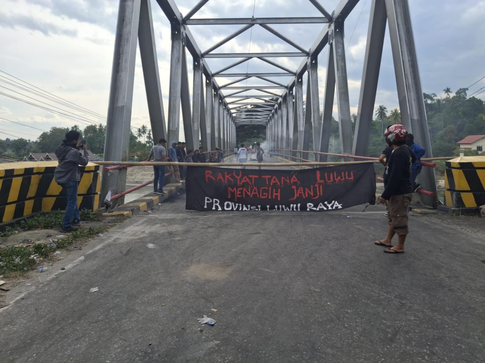 Sebagai bentuk tekanan politik, massa aksi menutup sementara Jalan Trans Sulawesi di Jembatan Baliase.