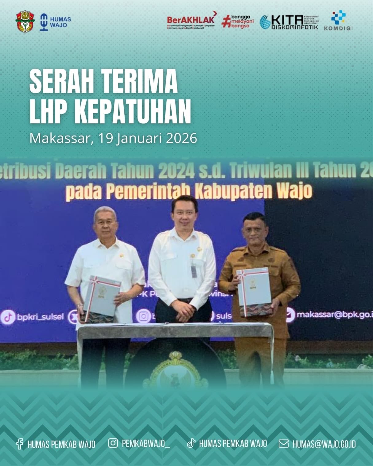 LHP Kepatuhan tersebut diserahkan langsung oleh Winner Franky Halomoan Manalu, selaku Kepala Badan Pemeriksa Keuangan (BPK) Perwakilan Provinsi Sulawesi Selatan, kepada Wakil Bupati Wajo dan Ketua DPRD Kabupaten Wajo.