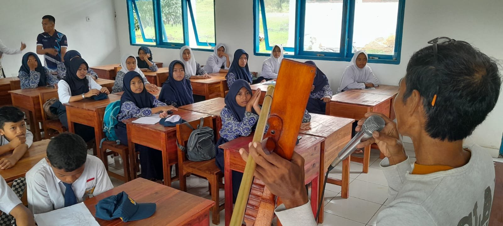 Sirajuddin Daeng Pata’ dan Haeruddin Ahar Daeng Nassa layaknya tengah jam session di hadapan guru dan siswa SMP Negeri 6 Polongbangkeng Utara, Rabu, 28 Januari 2026. Jam session adalah sesi bermain musik secara informal, spontan, dan tentu saja tanpa persiapan.