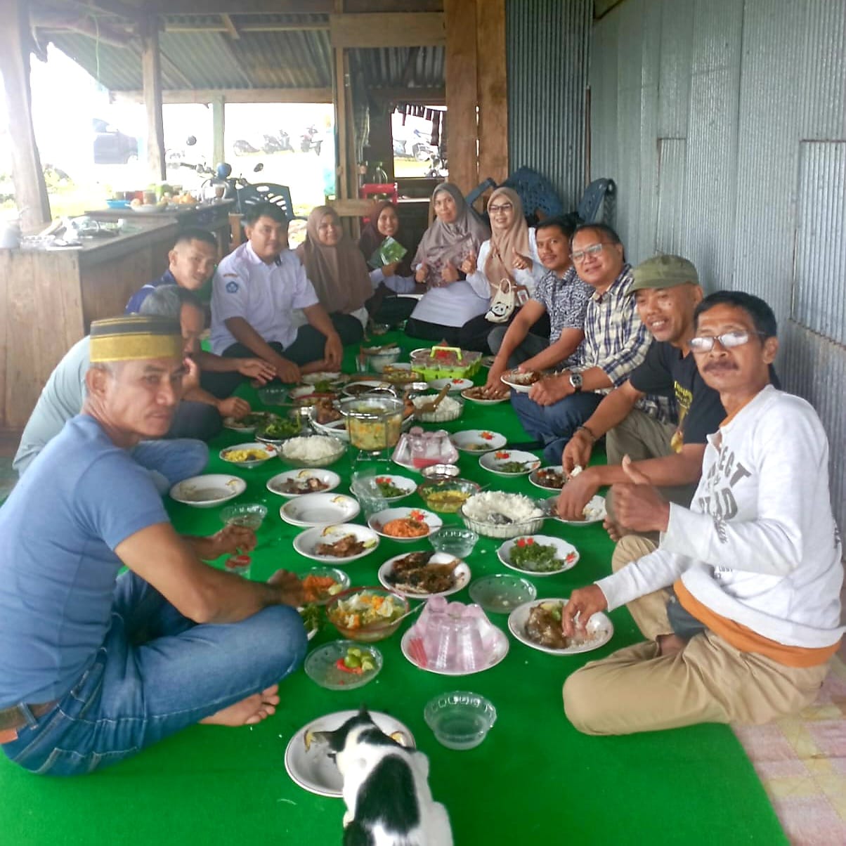 Oh iya, ada bonus dari tuan rumah. Kami disuguhkan santap siang. Bolu bakar, nila goreng, ayam, raca-raca taipa, sayur daun pepaya, dan sop hangat, di tata membentuk formasi yang siap dicicipi.
