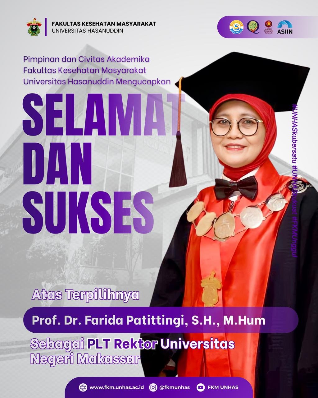 PELAKITA.ID – Pimpinan dan seluruh Civitas Akademika Fakultas Kesehatan Masyarakat (FKM) Universitas Hasanuddin menyampaikan ucapan selamat dan sukses kepada Prof. Dr. Farida Patittingi, S.H., M.Hum. atas terpilihnya sebagai Pelaksana Tugas (PLT) Rektor Universitas Negeri Makassar (UNM).