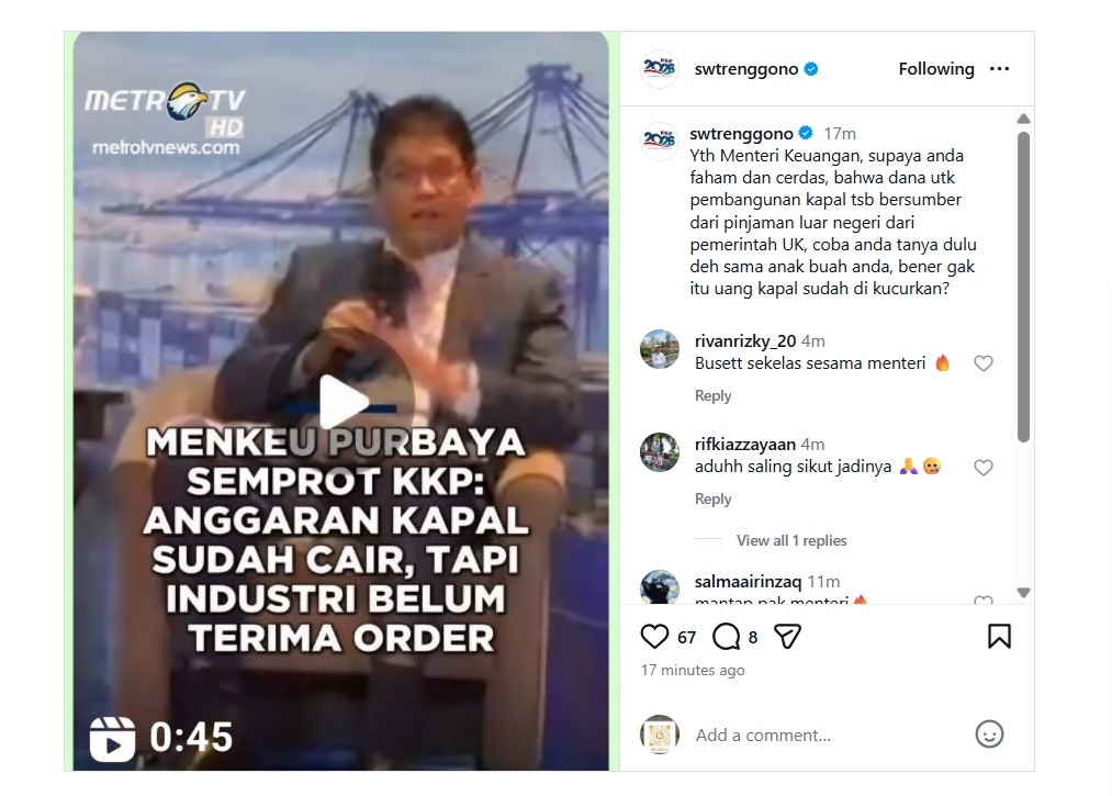 “Yth Menteri Keuangan, supaya anda faham dan cerdas, bahwa dana utk pembangunan kapal tsb bersumber dari pinjaman luar negeri dari pemerintah UK, coba anda tanya dulu deh sama anak buah anda, bener gak itu uang kapal sudah dikucurkan?” tulis Trenggono. Link — https://www.instagram.com/p/DUktl2QE6sG/