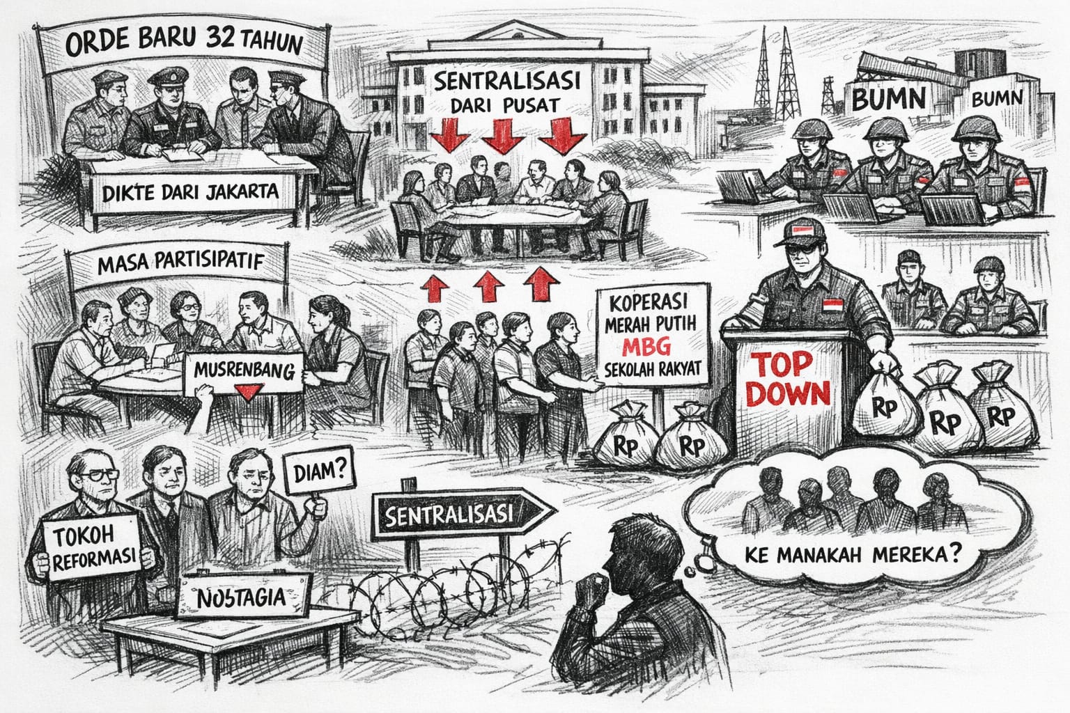 Kini kita berdiri pada fase yang terasa berbeda. Program Koperasi Merah Putih (KMP), Makan Bergizi Gratis (MBG), dan Sekolah Rakyat (SR) hadir sebagai kebijakan besar yang diluncurkan dengan kecepatan tinggi. Bersamaan dengan itu, pemotongan dana transfer daerah serta gerakan pengalihan anggaran yang dibungkus kata efisiensi menjadi sinyal lain yang sulit dihindari.