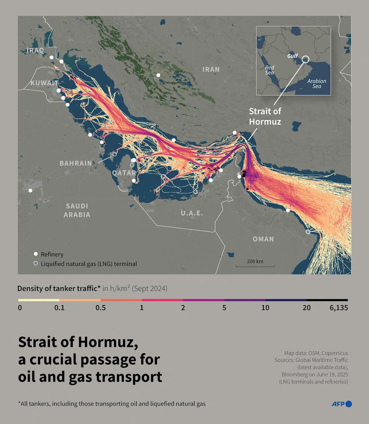 Secara garis besar, rute utama dari Selat Hormuz menuju Eropa adalah sebagai berikut: Selat Hormuz – Laut Oman – Samudra Hindia – Selat Bab el-Mandeb – Laut Merah – Terusan Suez – Laut Tengah – dan, jika menuju Eropa Utara, dilanjutkan melalui Selat Gibraltar ke Samudra Atlantik sebelum mencapai pelabuhan tujuan.