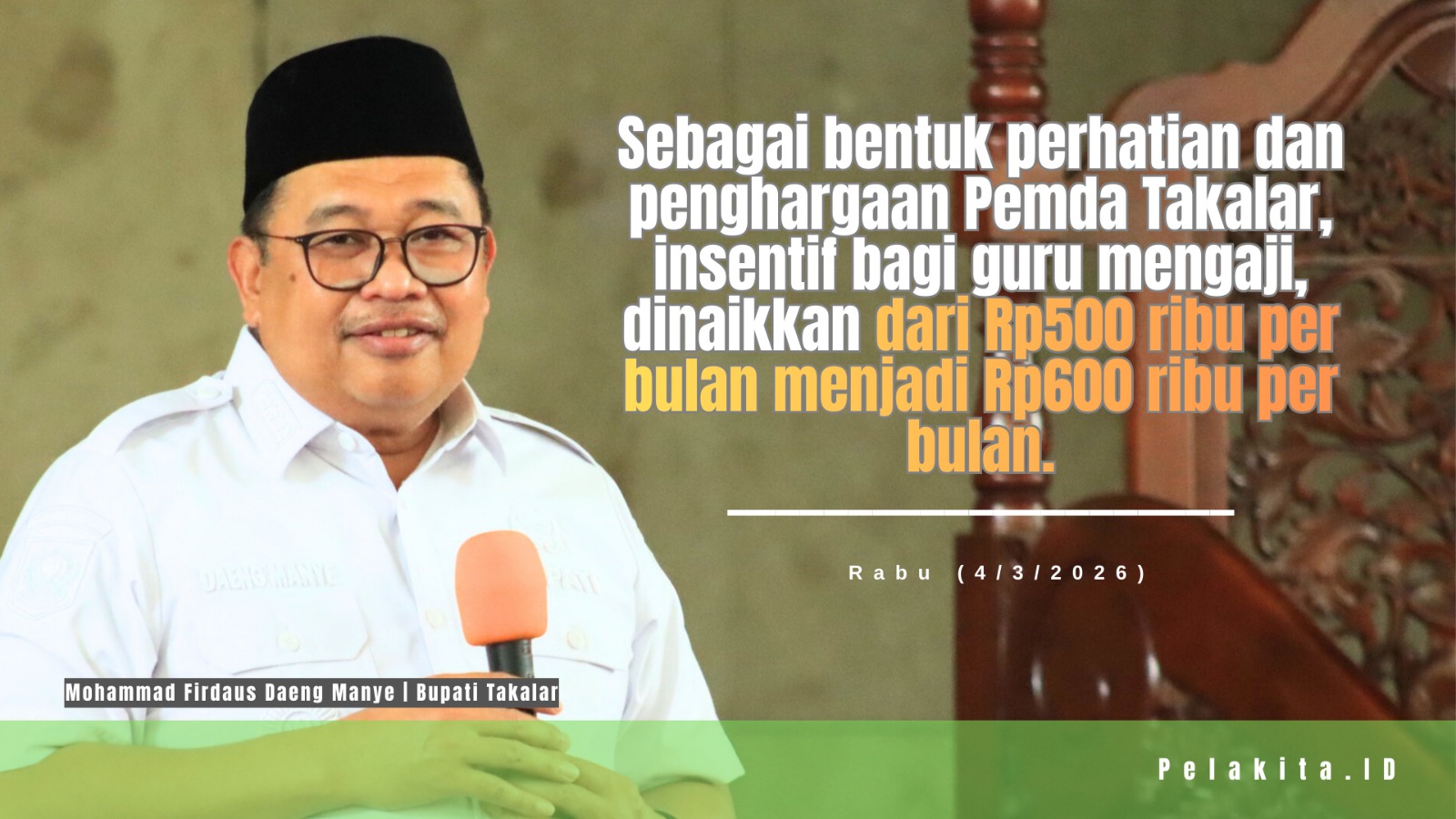 Sebagai bentuk perhatian dan penghargaan pemerintah daerah, insentif bagi guru mengaji yang sebelumnya sebesar Rp500 ribu per bulan dinaikkan menjadi Rp600 ribu per bulan.