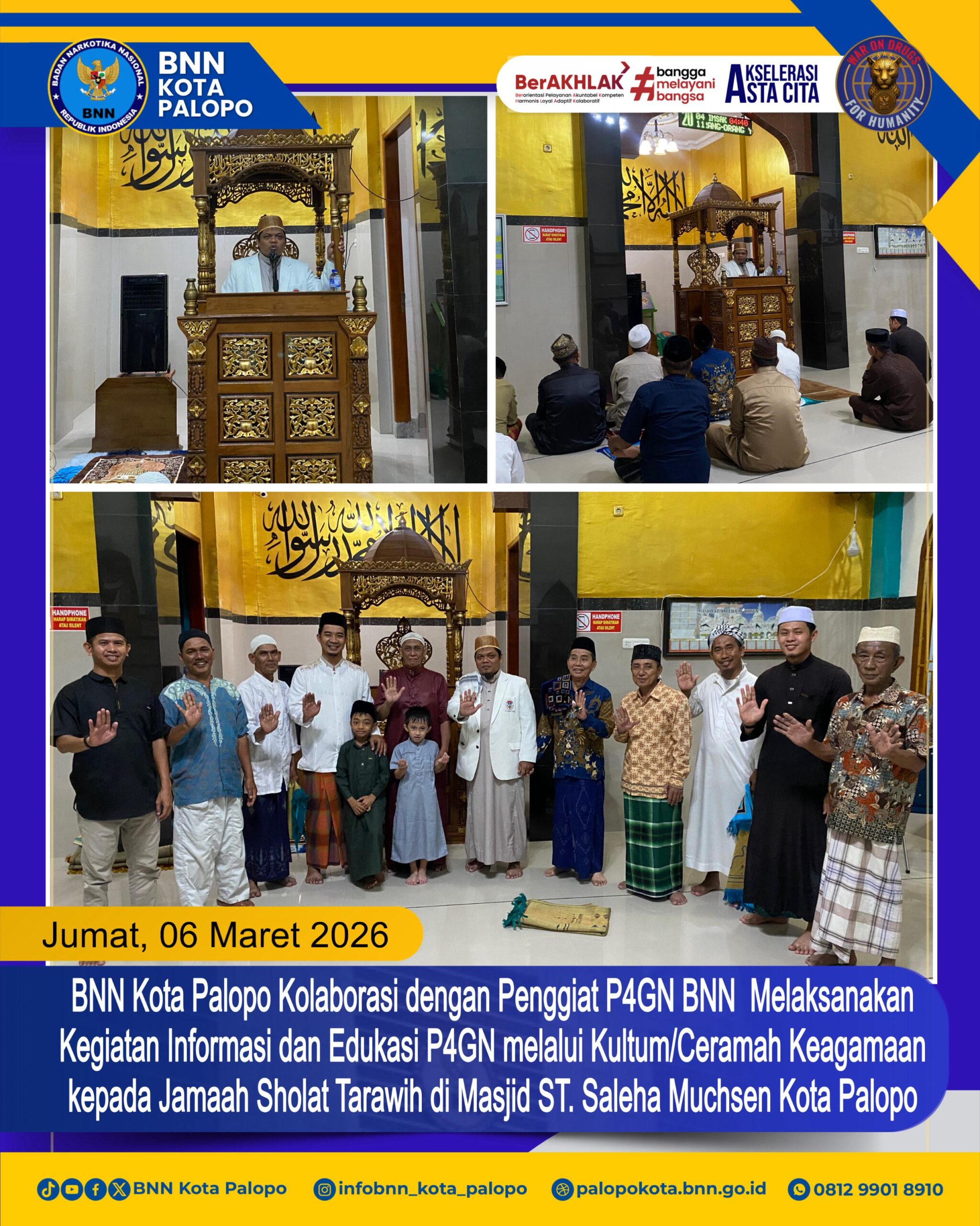 Ia juga mengajak jamaah untuk menjadikan masjid sebagai pusat pembinaan umat, tempat memperkuat iman dan takwa, sekaligus benteng moral dalam menghadapi berbagai tantangan sosial termasuk ancaman narkotika.