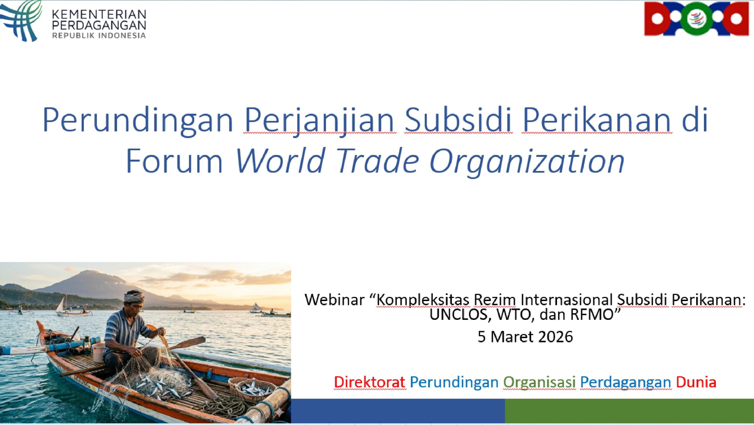 PELAKITA.ID – Dalam forum tersebut, seorang pejabat dari Direktorat Perundingan Organisasi Perdagangan Dunia (POPD), Kementerian Perdagangan Republik Indonesia memaparkan secara komprehensif dinamika perundingan subsidi perikanan di forum perdagangan internasional serta interaksinya dengan rezim hukum laut internasional.