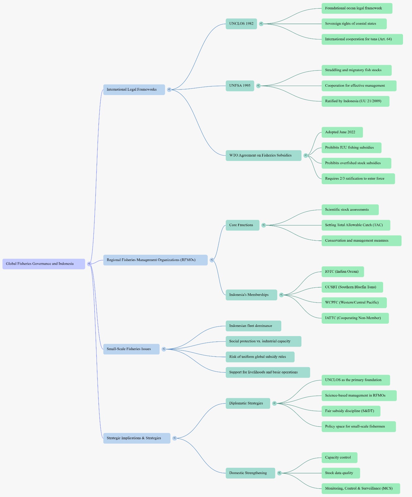 Untuk menghadapi kompleksitas rezim pengelolaan perikanan global, Indonesia mengembangkan sejumlah strategi kebijakan. Pertama, memastikan bahwa prinsip-prinsip UNCLOS tetap menjadi dasar utama dalam pengelolaan sumber daya laut, terutama terkait hak berdaulat negara pantai di Zona Ekonomi Eksklusif.
