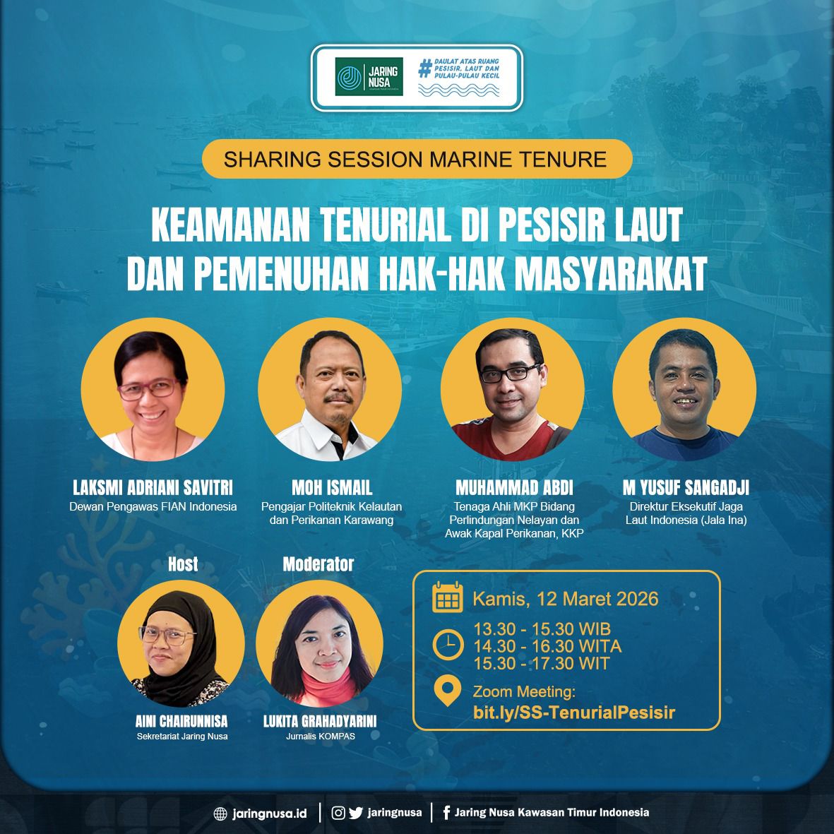 Pada Sharing Session Marine Tenure, bertema Keamanan Tenurial di Pesisir dan Laut dan Pemenuhan Hak-hak Masyarakat, yang diselenggarakan Jaring Nusa. Dinamisator Jaring Nusa, Asmar Exwar, menjelaskan bahwa diskusi mengenai hak dan akses masyarakat pesisir terhadap ruang hidup mereka perlu terus diperkuat melalui dialog publik, pertukaran pengetahuan, serta pembelajaran bersama.
