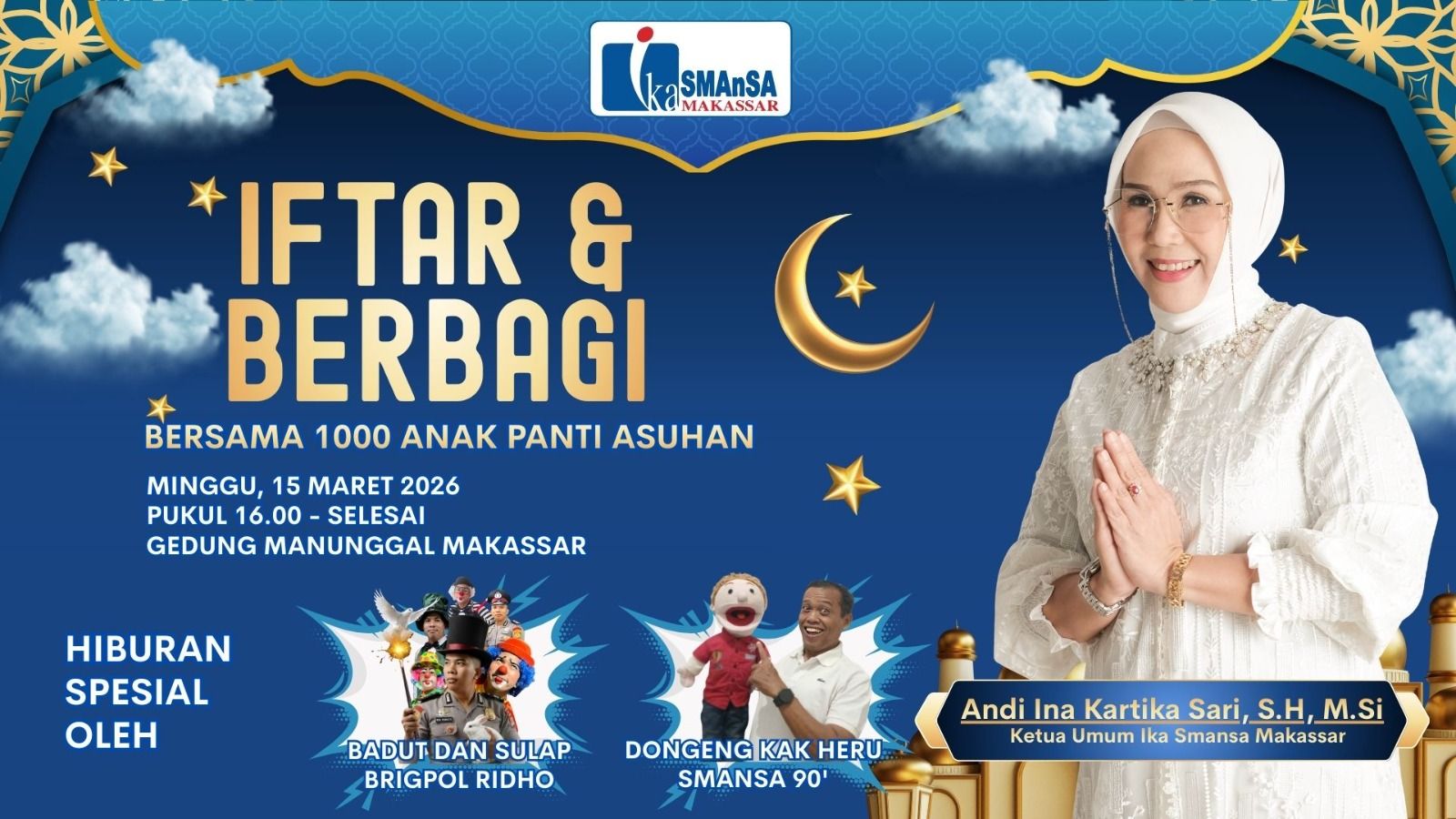 Puncaknya adalah pelaksanaan Buka Puasa PP IKA Smansa bersama 1.000 Anak Yatim di Balai Manunggal yang dihadiri Ketua Umum IKA Smansa Makassar, Andi Ina Kartika Sari.