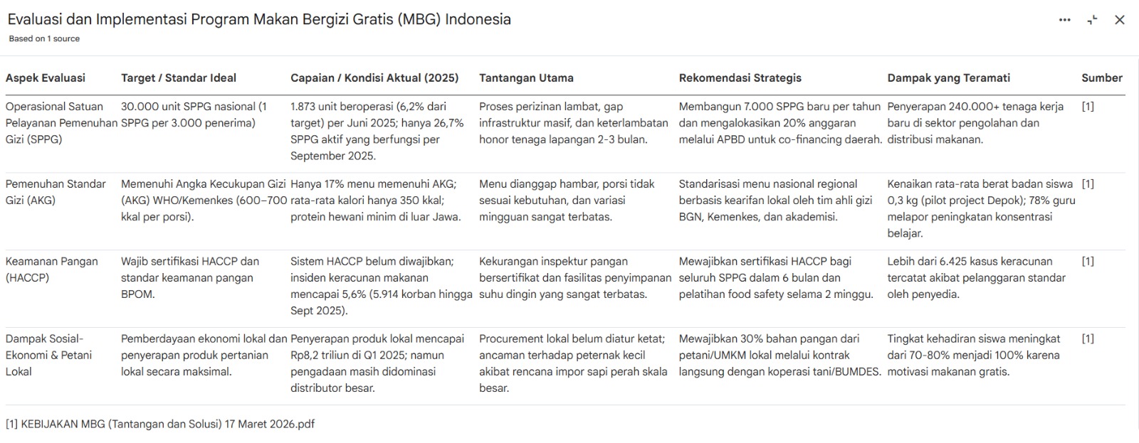 Kajian CISDI (2025) menemukan hanya 17% menu yang memenuhi Angka Kecukupan Gizi (AKG). Terdapat defisiensi protein hewani yang signifikan, terutama di wilayah luar Jawa. Selain itu, insiden keracunan massal di Grobogan pada Januari 2026 menjadi peringatan keras (recent warning) atas absennya kewajiban sertifikasi HACCP di seluruh unit SPPG.
