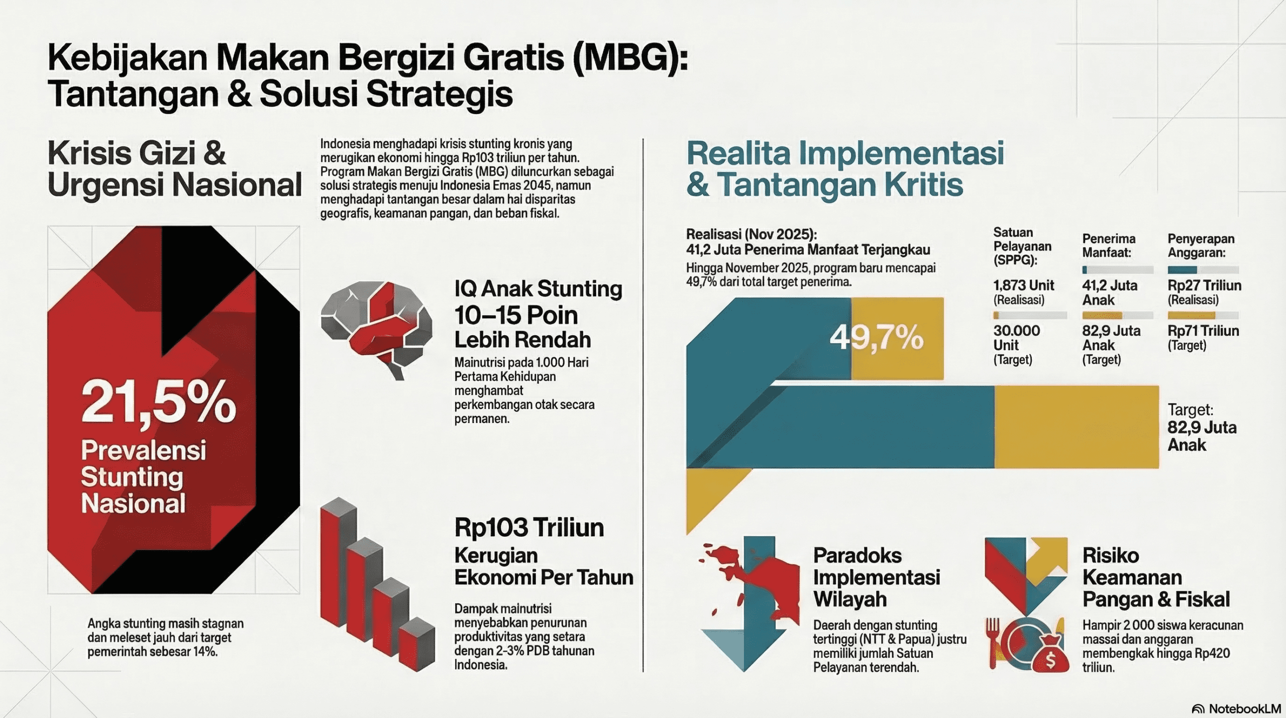 Prevalensi Stunting: 21,5% (SSGI 2023), menempatkan Indonesia pada posisi No. 2 tertinggi di dunia untuk kategori anak stunting berat.