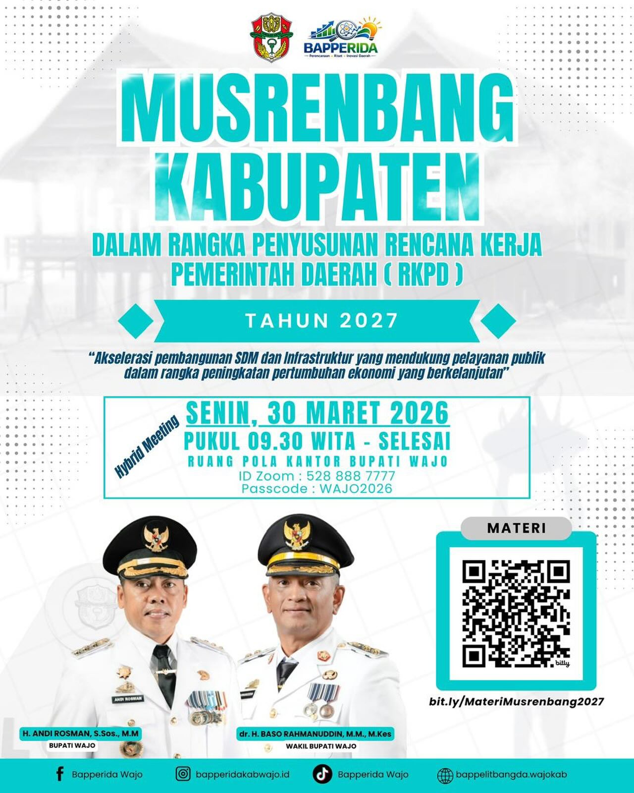 PELAKITA.ID – Pemerintah Kabupaten akan menyelenggarakan Musyawarah Perencanaan Pembangunan (Musrenbang) Kabupaten dalam rangka penyusunan Rencana Kerja Pemerintah Daerah (RKPD) Tahun 2027 pada Senin, 30 Maret 2026, bertempat di Ruang Pola Kantor Bupati dan dilaksanakan secara hybrid.
