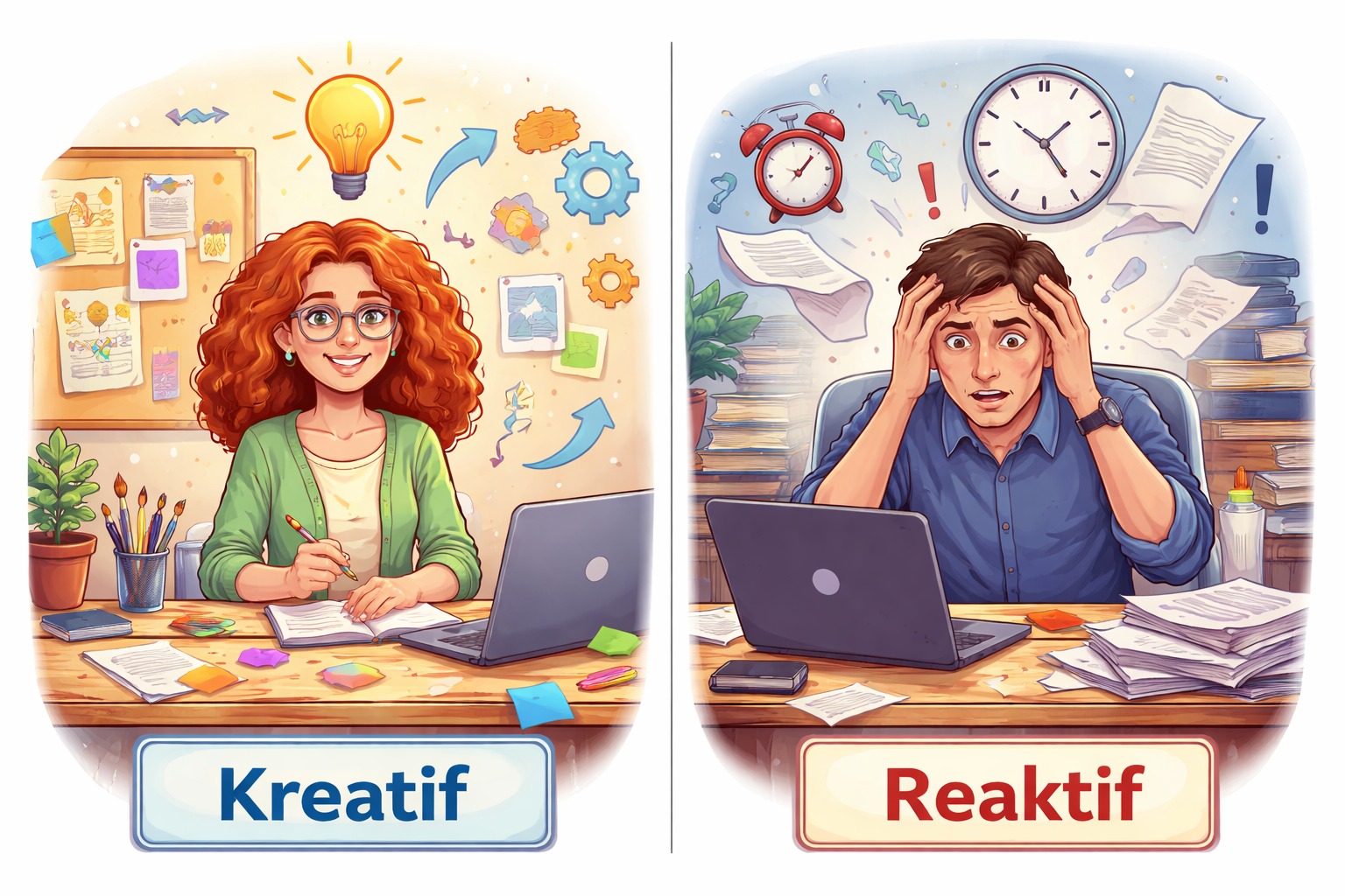 Sebaliknya, pendekatan reaktif bersifat responsif—bergantung pada rangsangan eksternal, di mana tindakan dibentuk oleh peristiwa, tekanan, atau situasi yang telah terjadi. Secara sederhana, perilaku kreatif memimpin perubahan, sedangkan perilaku reaktif mengikutinya.