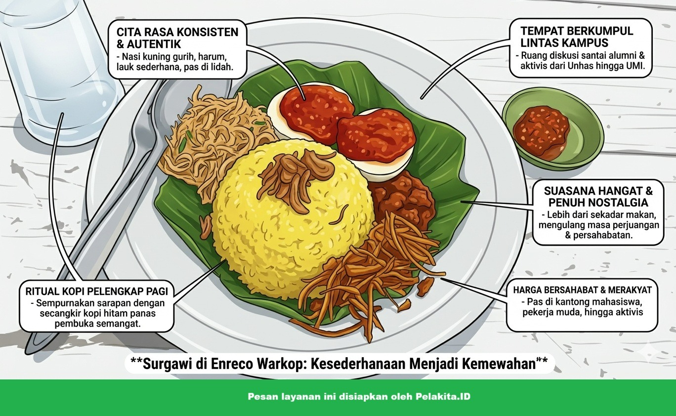 PELAKITA.ID – Di tengah hiruk pikuk pagi Makassar, ada satu tempat sederhana yang menyimpan rasa, cerita, dan nostalgia: Enreco Warkop. Terletak di samping Mall Panakukang, tidak jauh dari pertigaan Boulevard, warkop ini menjadi titik temu lintas generasi—terutama para alumni kampus dan aktivis.
