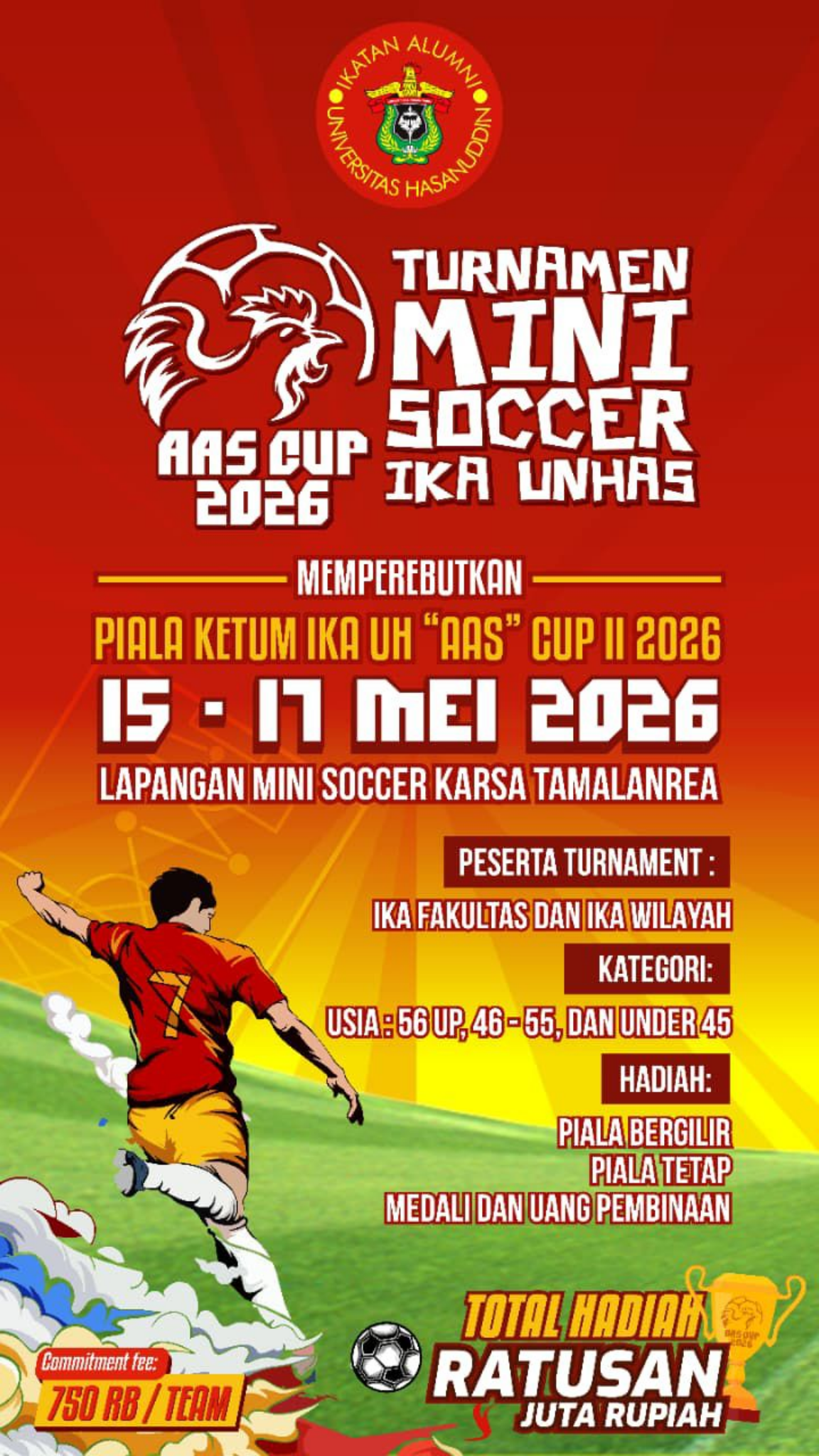 Untuk mengikuti turnamen, setiap tim dikenakan biaya komitmen sebesar Rp750.000. Panitia berharap partisipasi aktif dari para alumni untuk menyukseskan kegiatan ini sekaligus memperkuat solidaritas dan kebersamaan di lingkungan IKA Unhas.