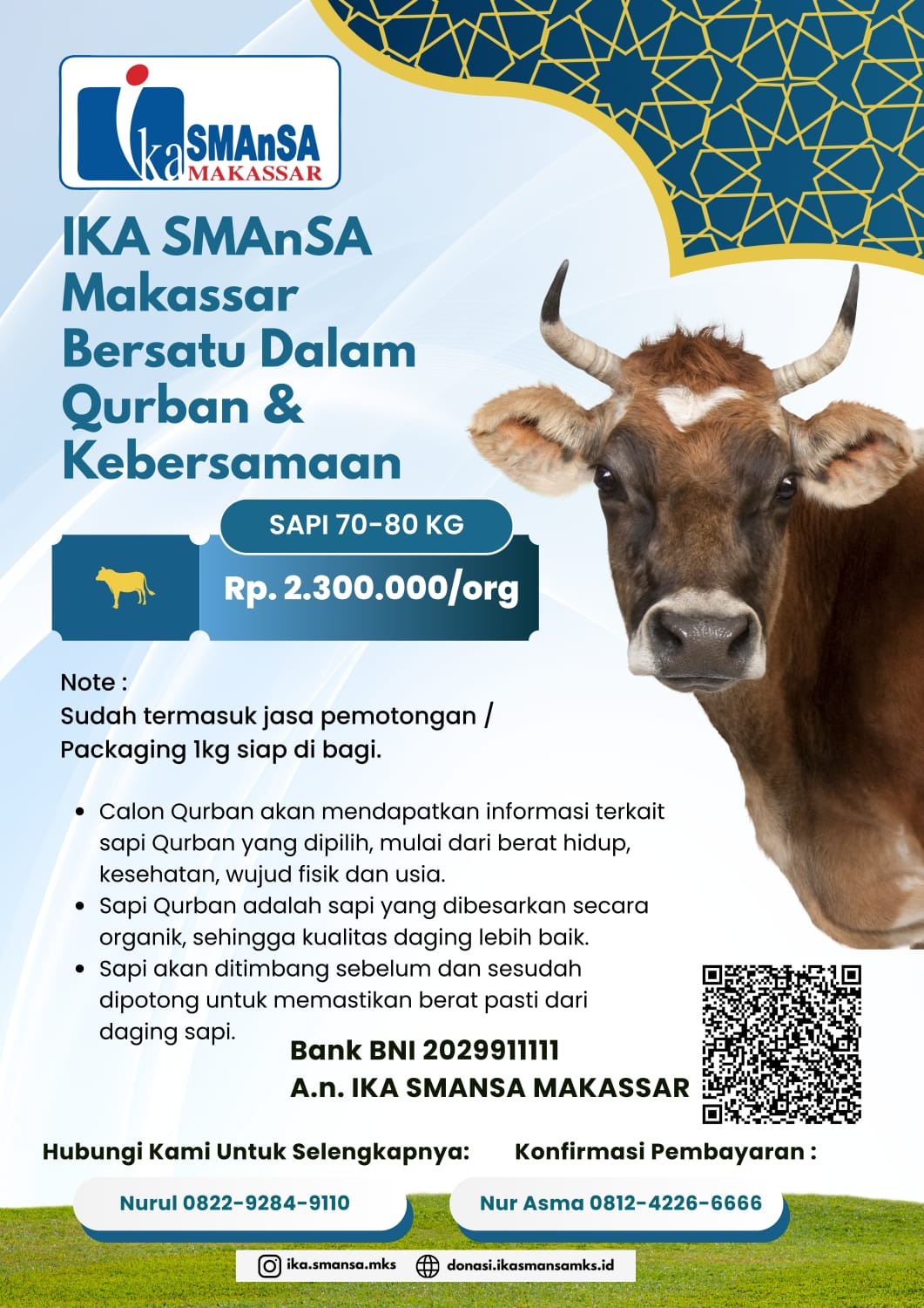 Dalam program ini, IKA SMANSA Makassar menawarkan paket qurban sapi dengan kisaran berat 70–80 kilogram, dengan kontribusi sebesar Rp2.300.000 per orang.