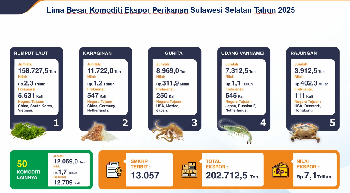 Tahun 2025 menjadi tonggak penting bagi ekonomi perikanan Sulawesi Selatan. Data menunjukkan bahwa sektor ini tidak hanya besar, tetapi juga terus tumbuh secara berkelanjutan. Volume Ekspor: 202.712,5 Ton | Nilai Ekspor: Rp 7,1 Triliun | Pertumbuhan: +0,8% (vs 2024)