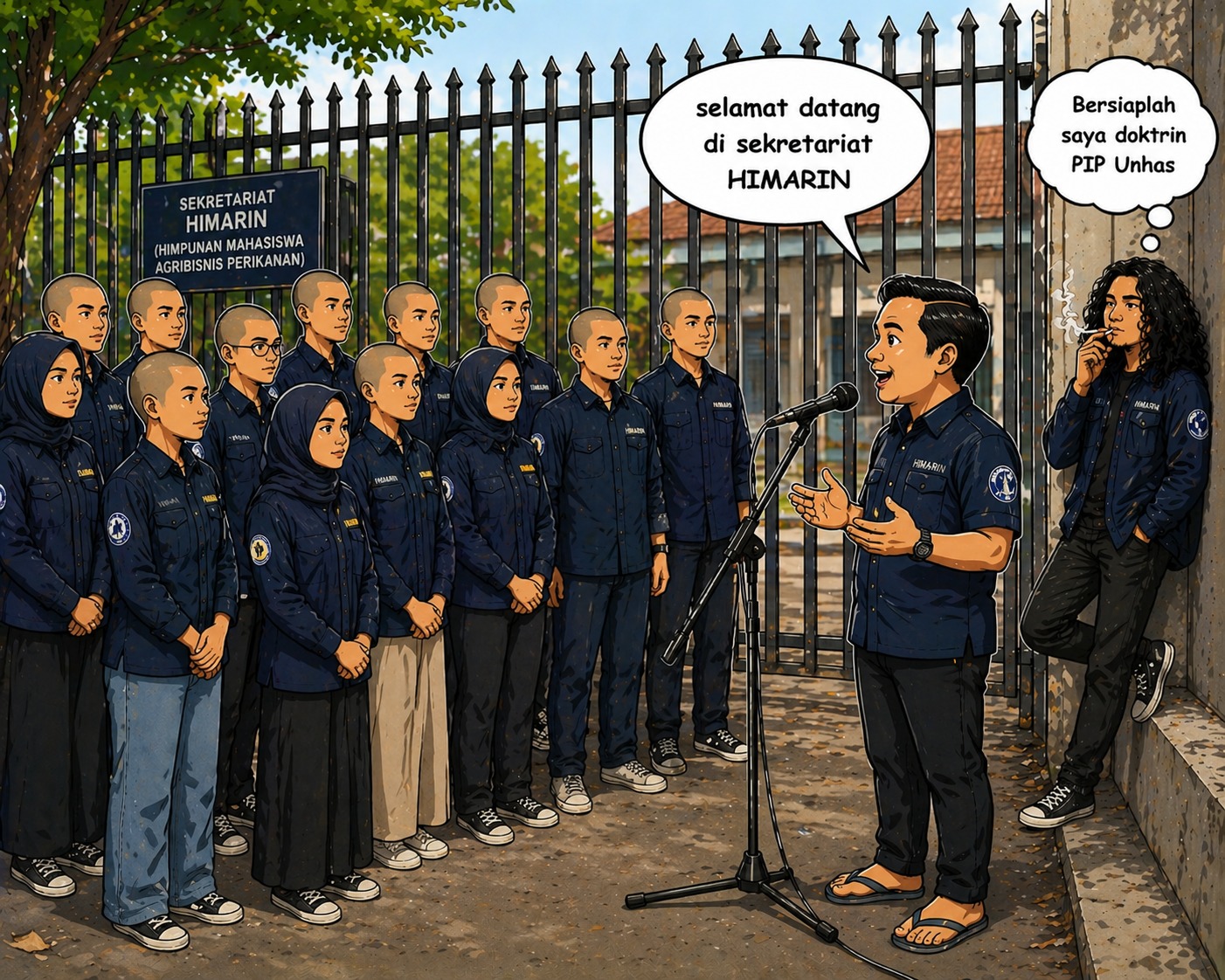 Di sudut lain, bersandar santai pada dinding, seorang pria berambut gondrong keriting mengisap rokoknya dengan tenang—Yarifay Mappeati, sosok senior yang dikenal sebagai pendoktrin mahasiswa baru dan lama.